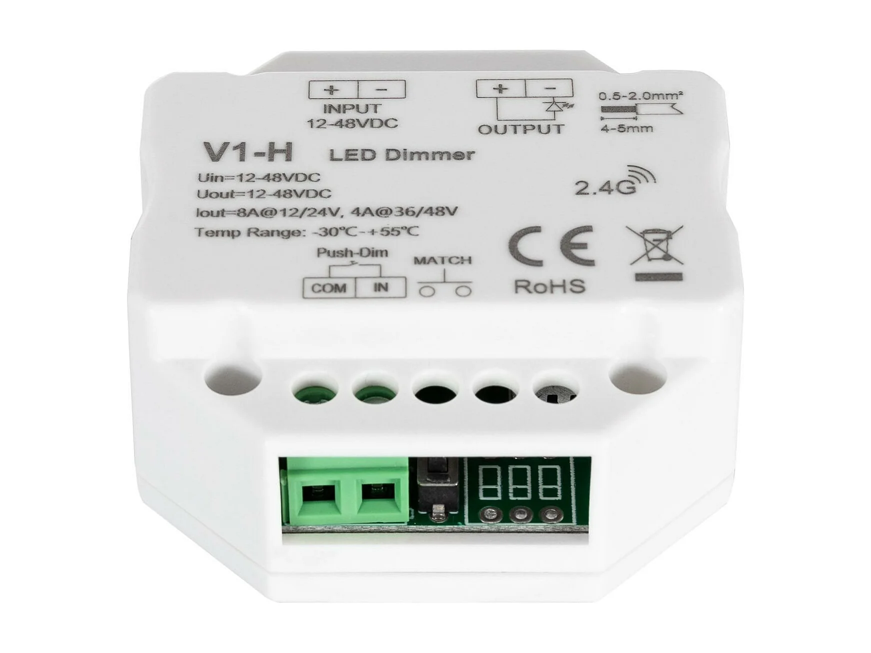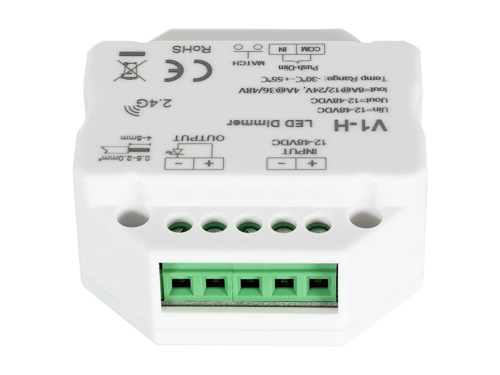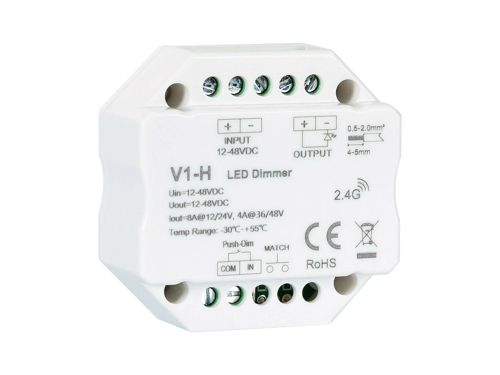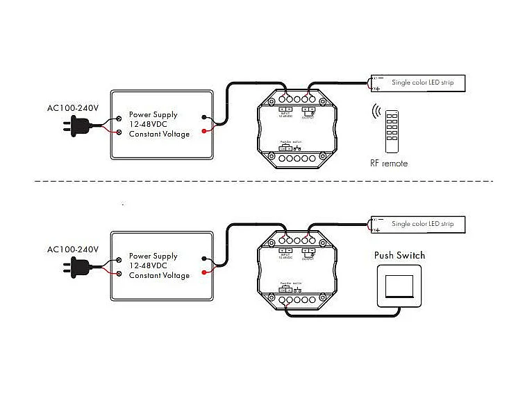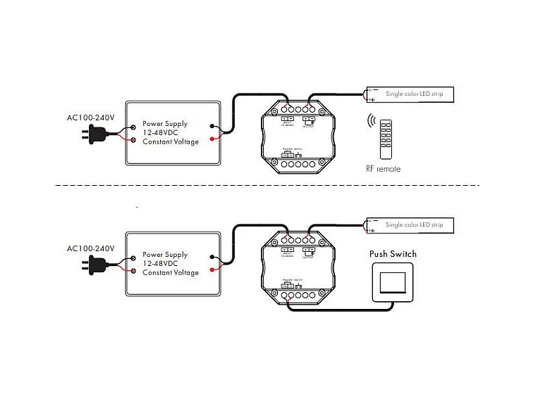 Module de Variation LED RF 12/48V pour Ruban LED Monochrome Compatible avec Bouton-Poussoir Blanc