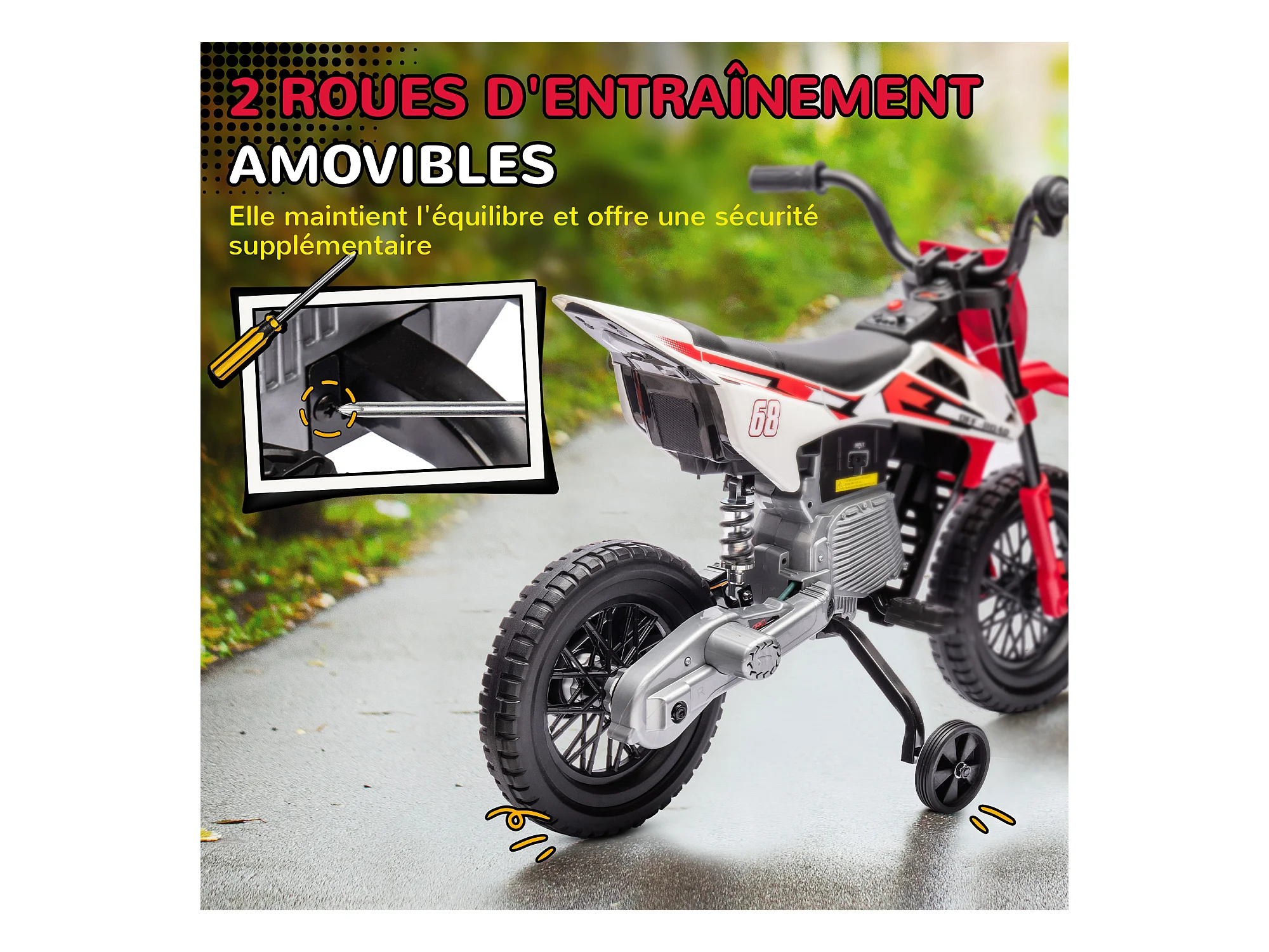 Moto électrique pour enfants 25 W 6 V 3 Km/h effets lumineux et sonores roulettes amovibles rouge