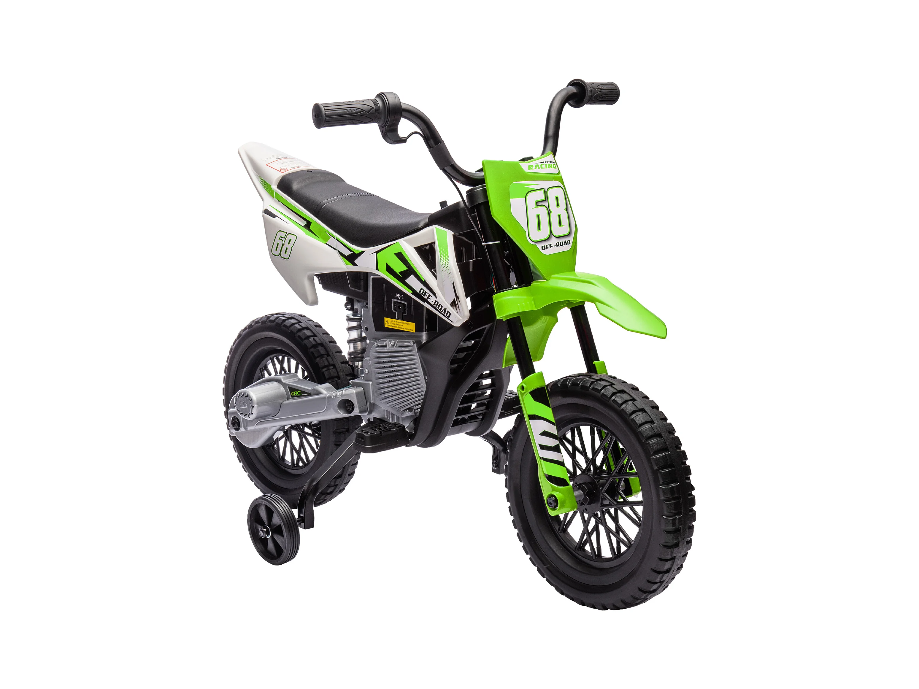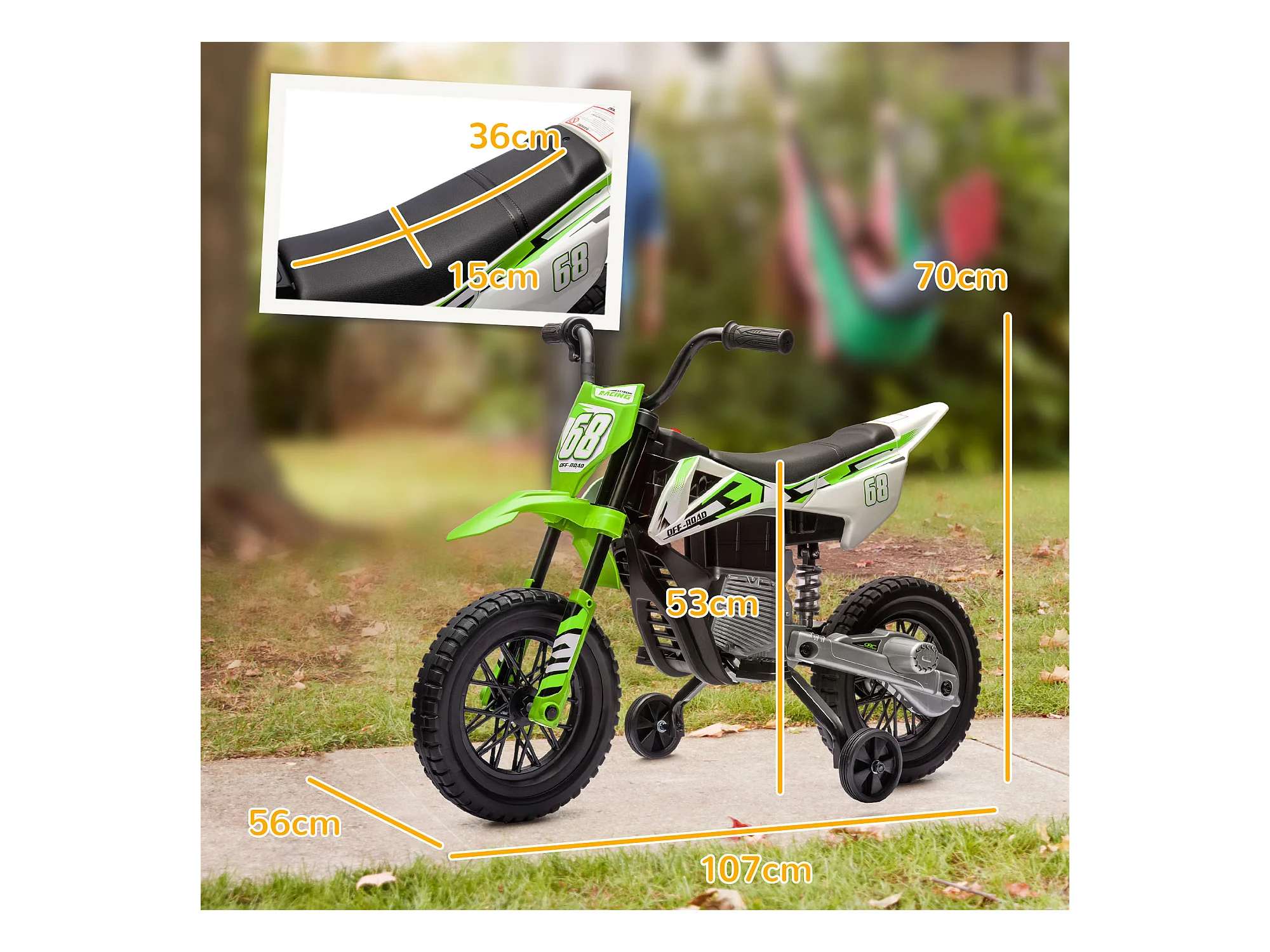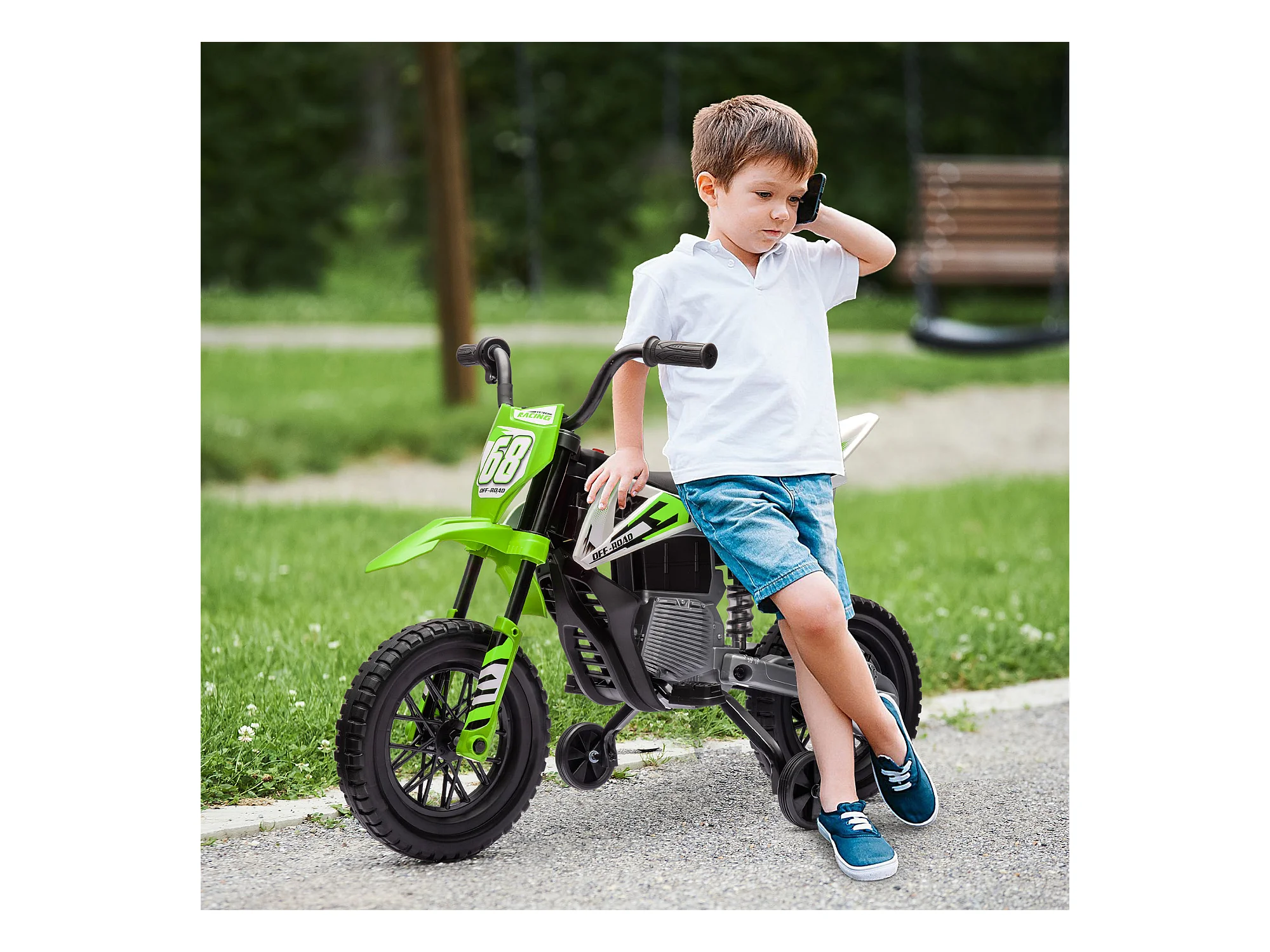 Moto cross électrique pour enfant 3 à 5 ans 12 V 3-8 Km/h avec roulettes latérales amovibles dim. 106,5L x 51,5l x 68H cm vert