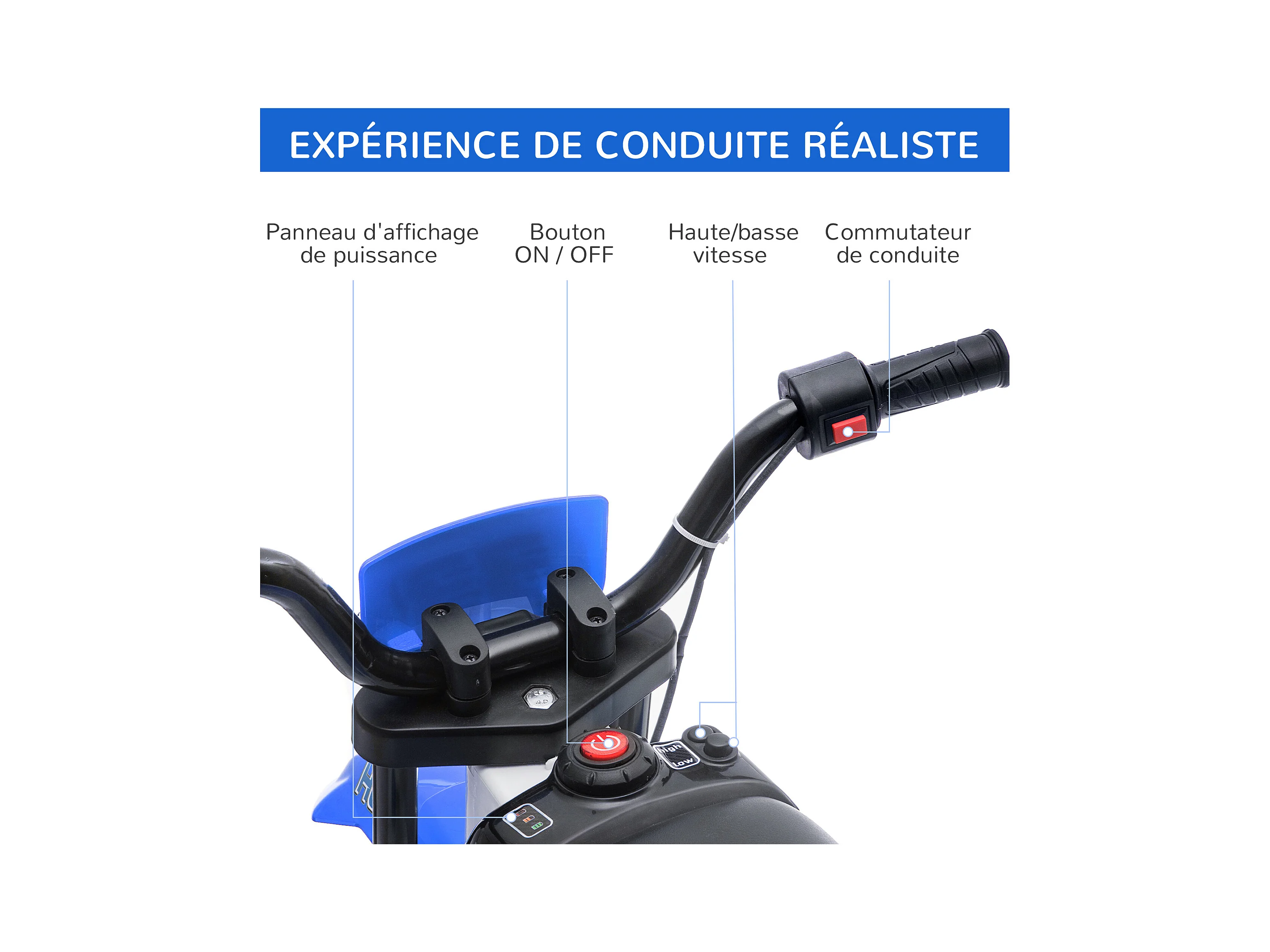 Moto cross électrique enfant 3 à 5 ans 12 V 3-8 Km/h avec roulettes latérales amovibles dim. 106,5L x 51,5l x 68H cm bleu