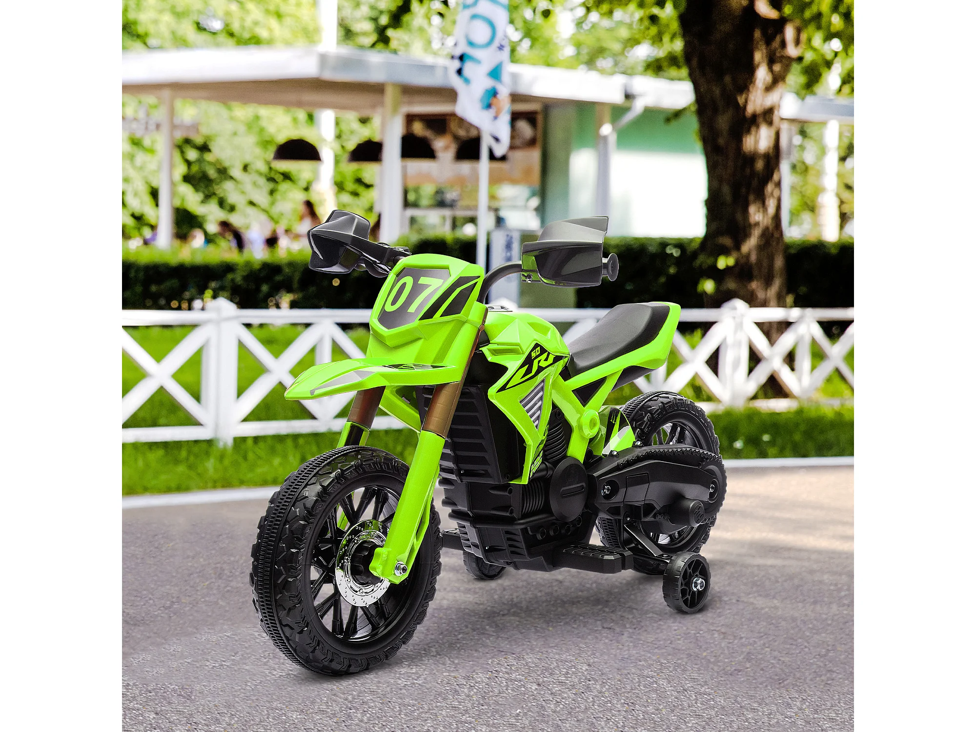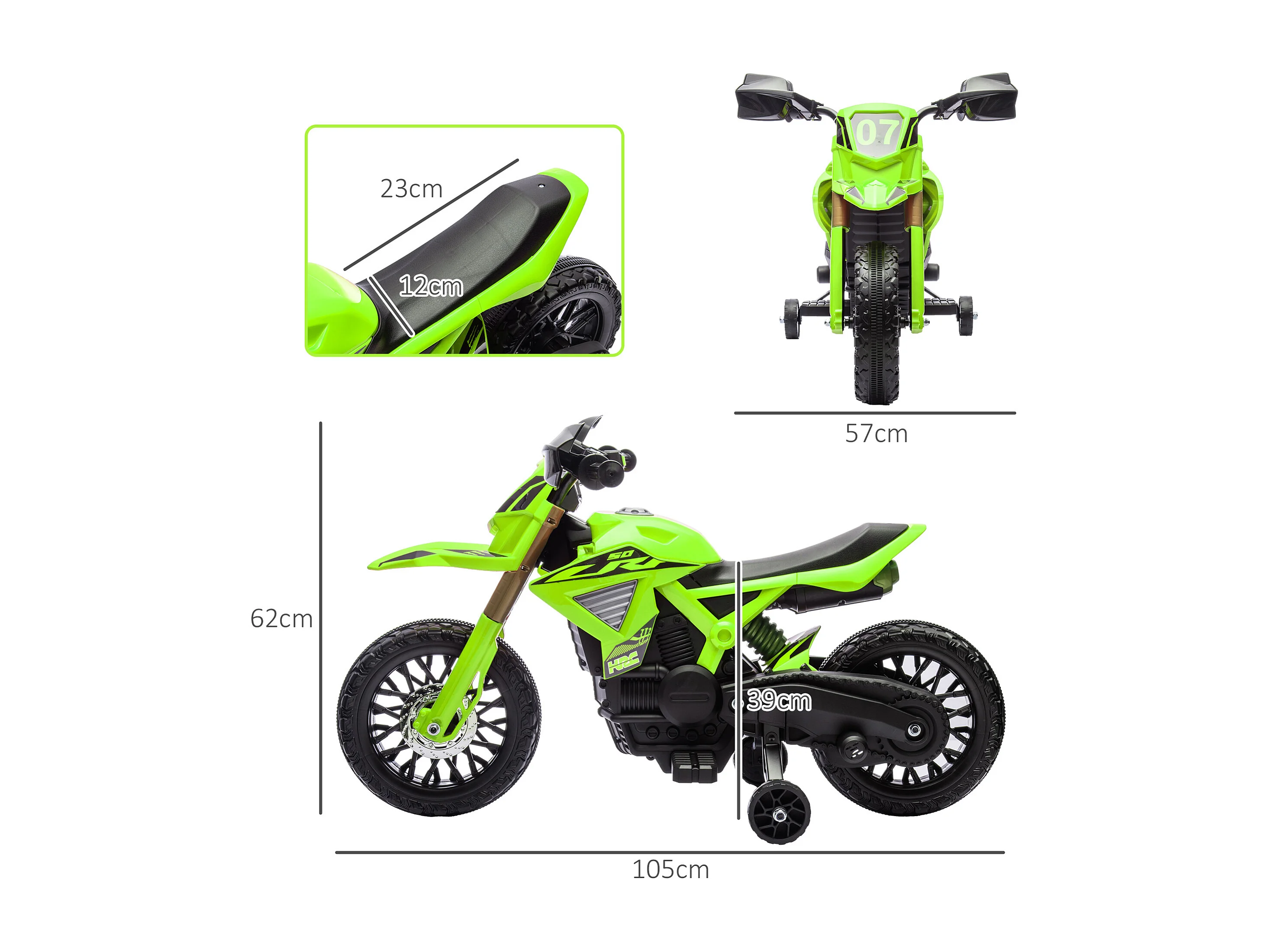 Moto cross électrique pour enfant 3 à 5 ans 12 V 3-8 Km/h avec roulettes latérales amovibles dim. 106,5L x 51,5l x 68H cm vert