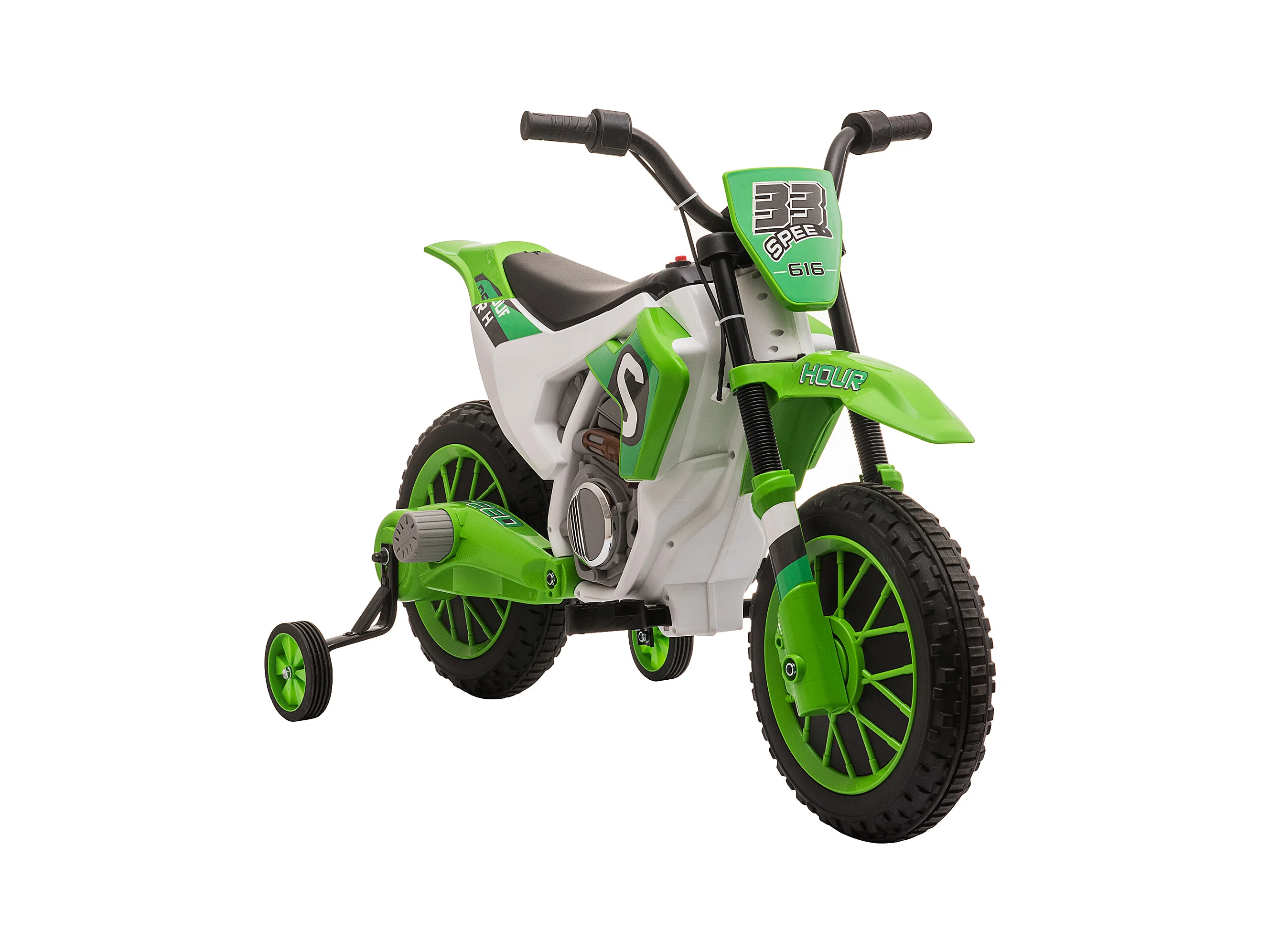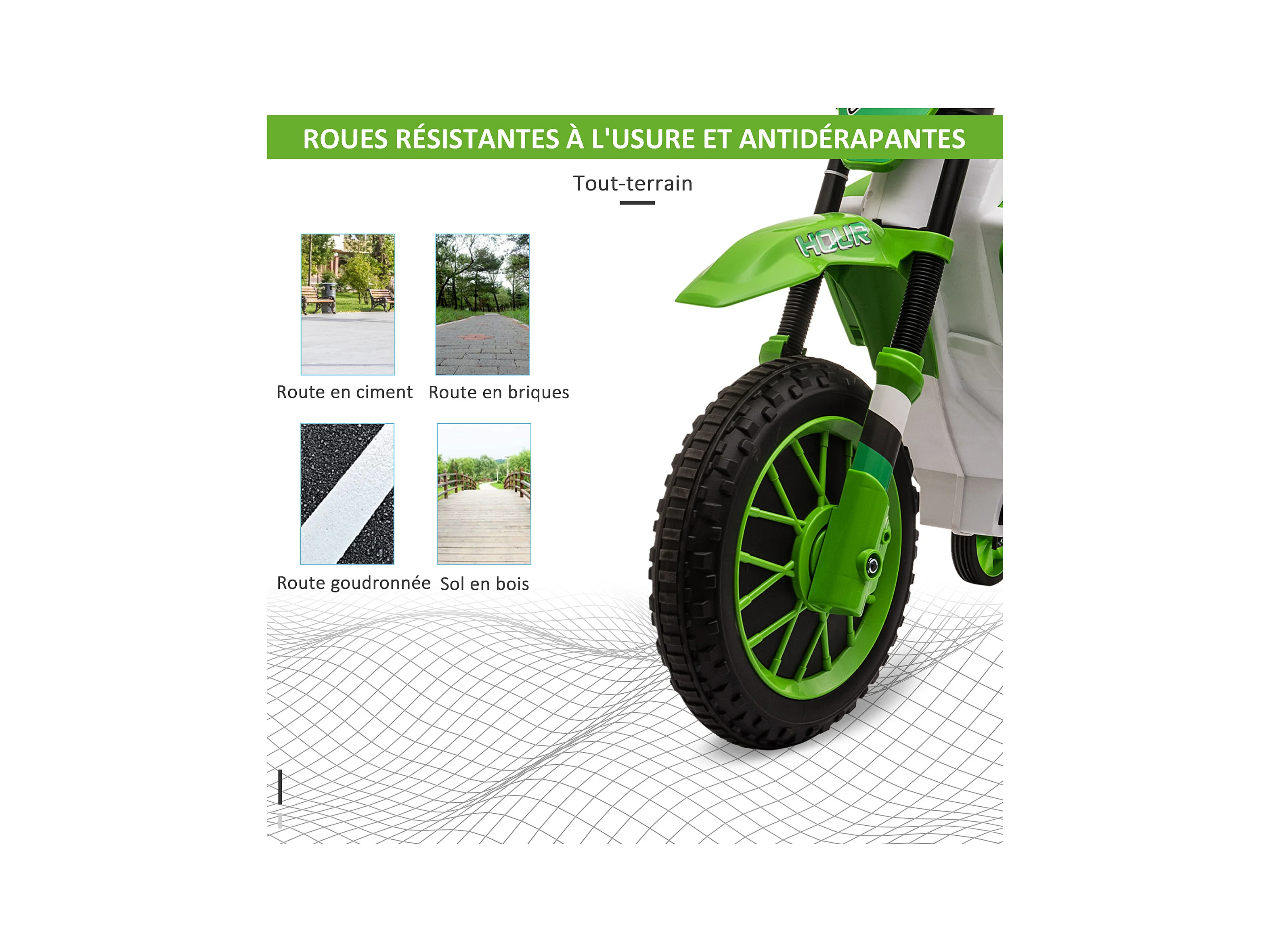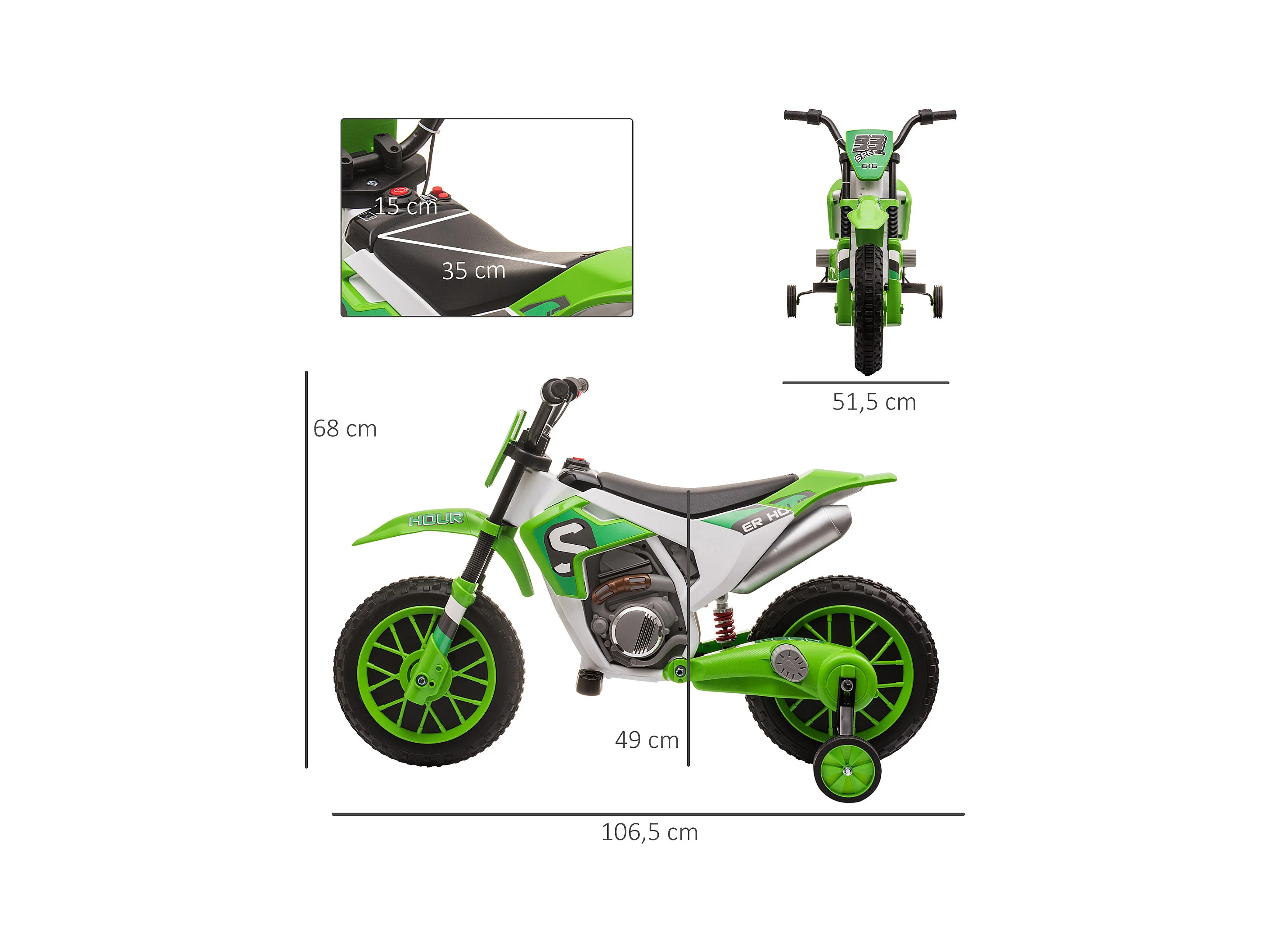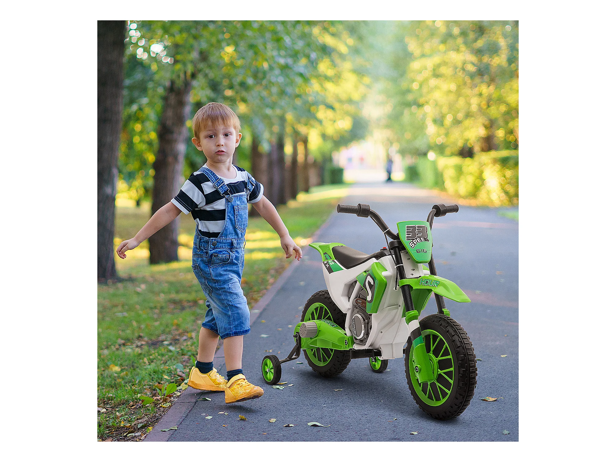 Moto cross électrique pour enfant 3 à 5 ans 12 V 3-8 Km/h avec roulettes latérales amovibles dim. 106,5L x 51,5l x 68H cm vert