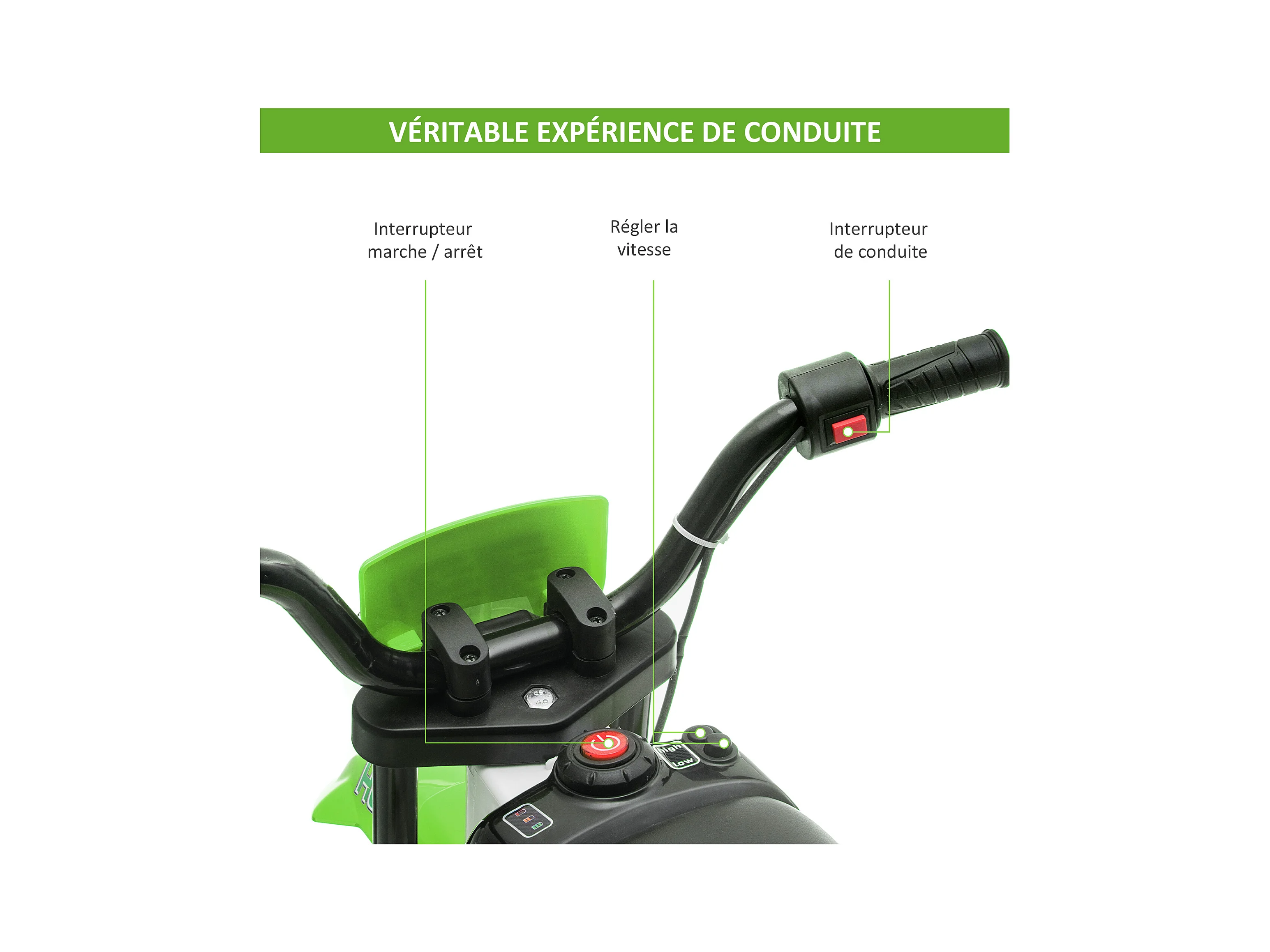 Moto Cross électrique enfant 3 à 6 ans 6 V phares klaxon musiques 102 x 53 x 66 cm vert et noir