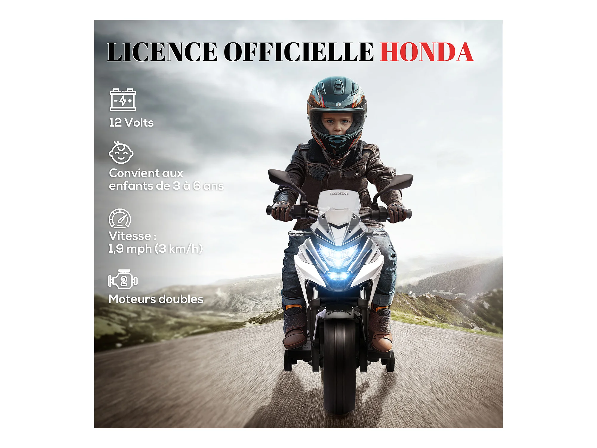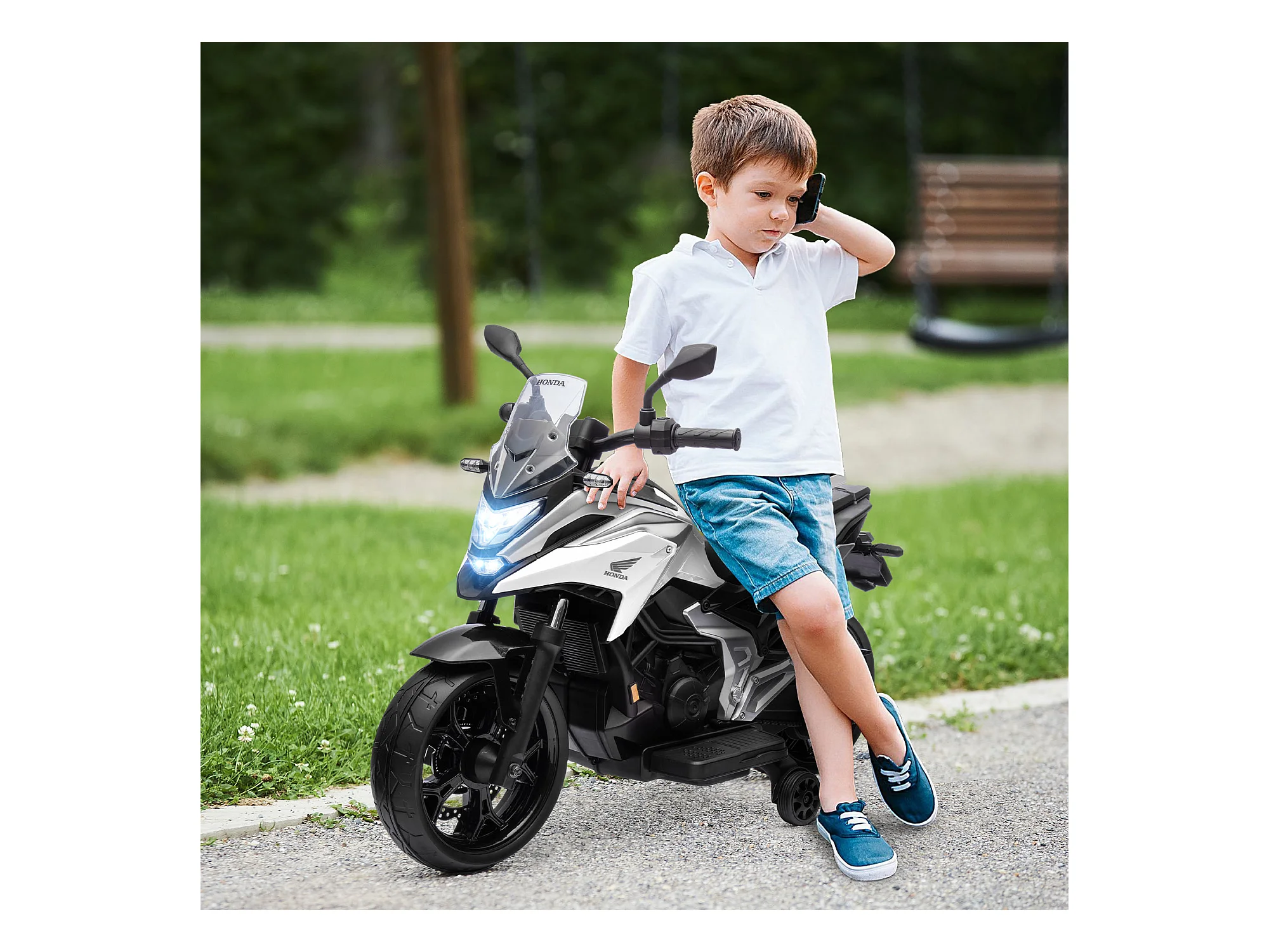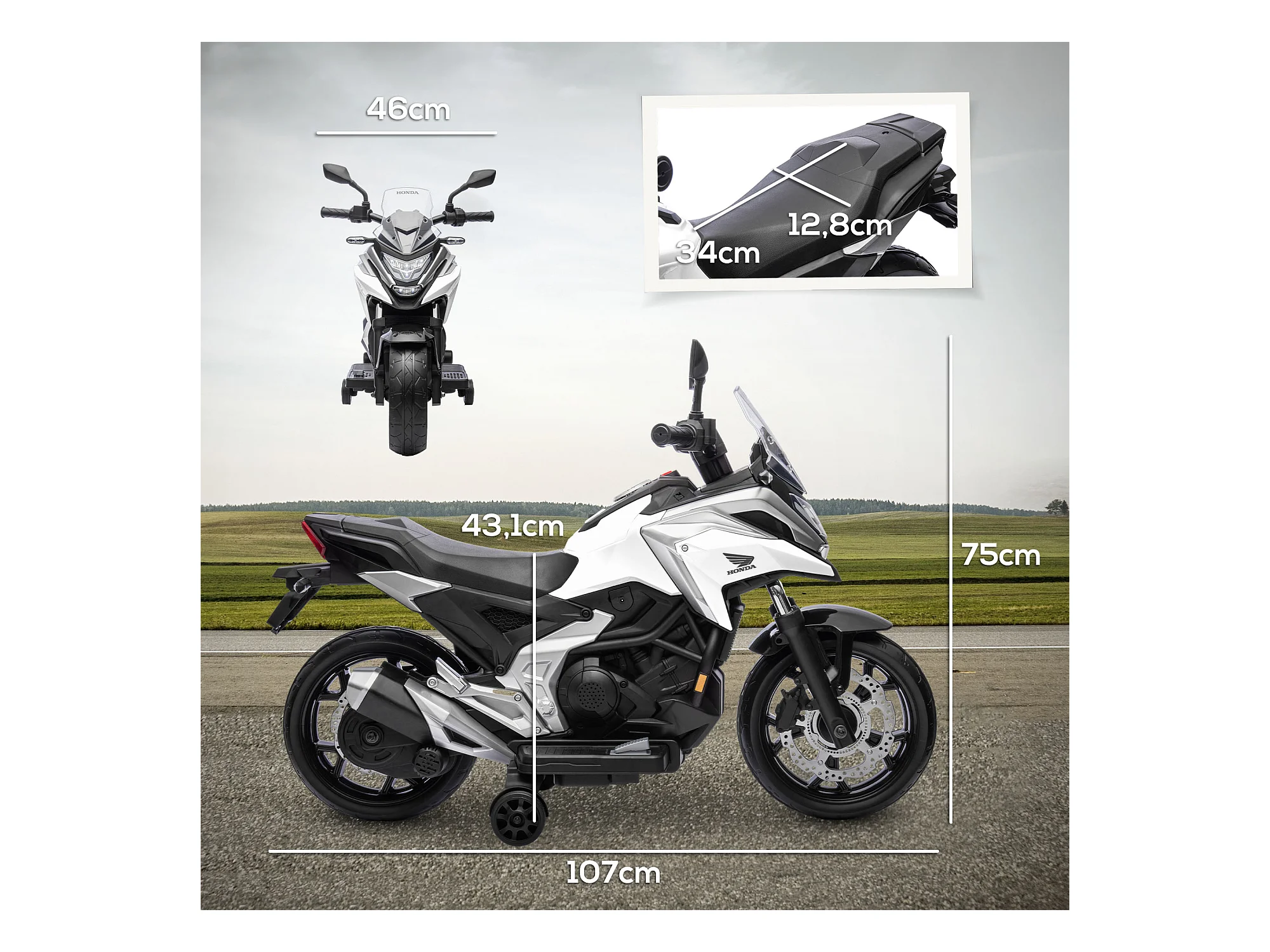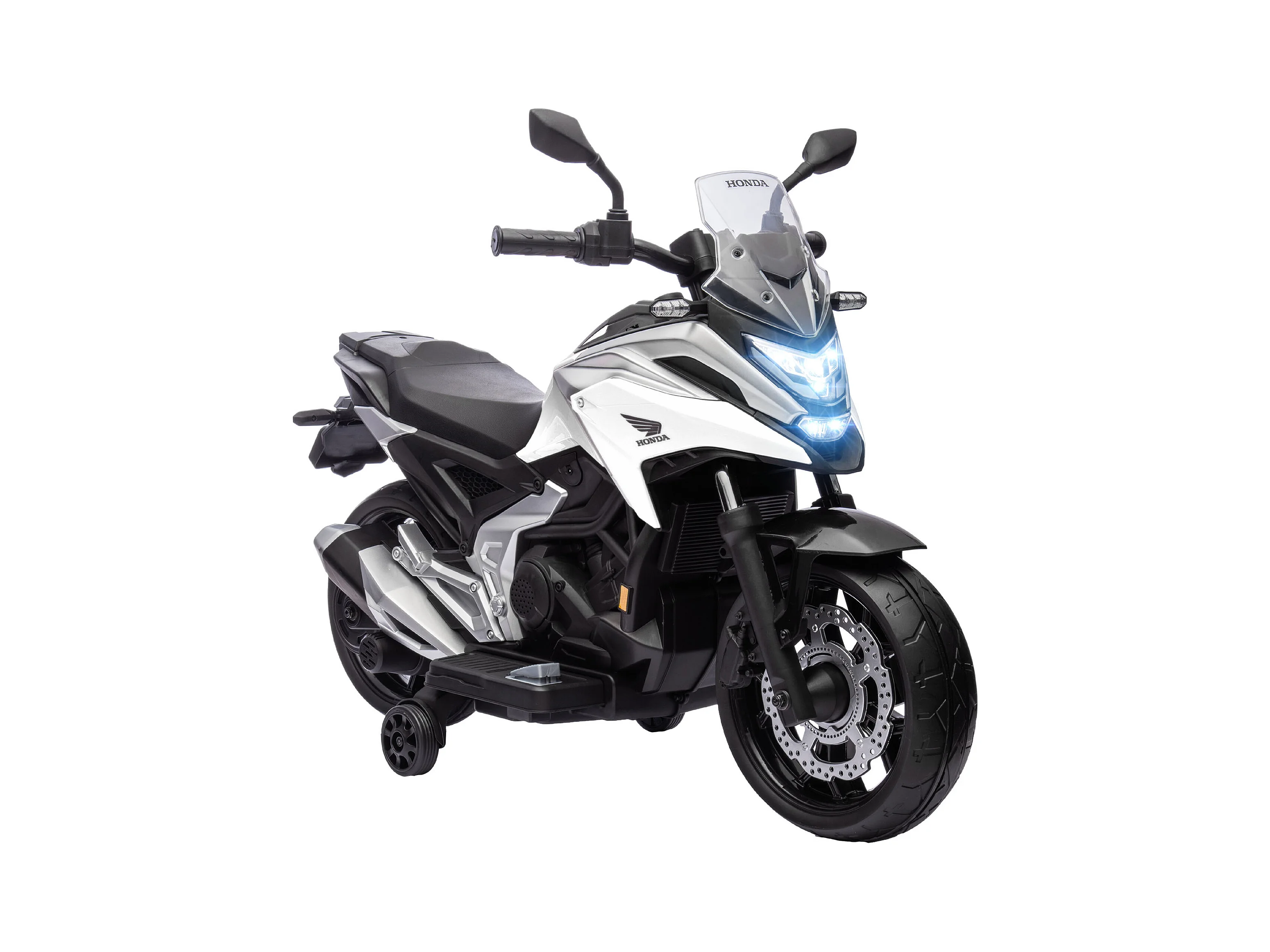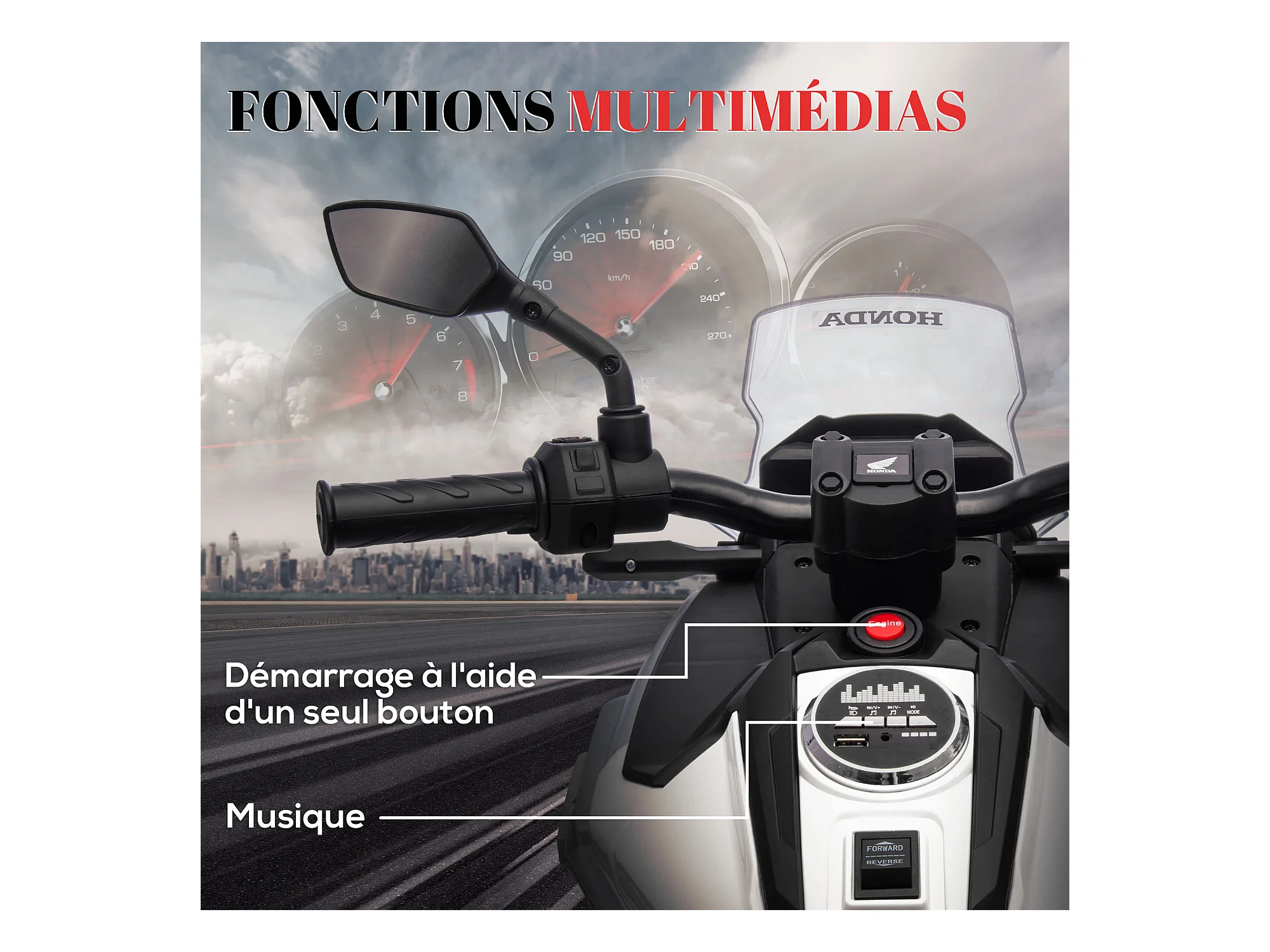 Moto électrique enfant Honda NC750x - musiques, feux AV LED, entrée USB MP3 jack - 2 roues support aux. - blanc