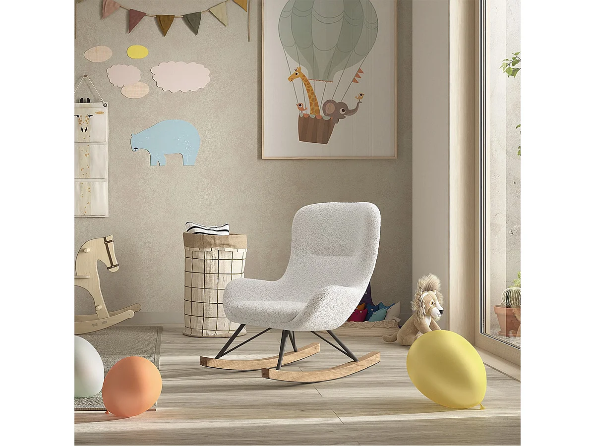 MOUTY - Chaise à Bascule Enfant en Tissu Bouclette Blanc Pieds Bois et Métal