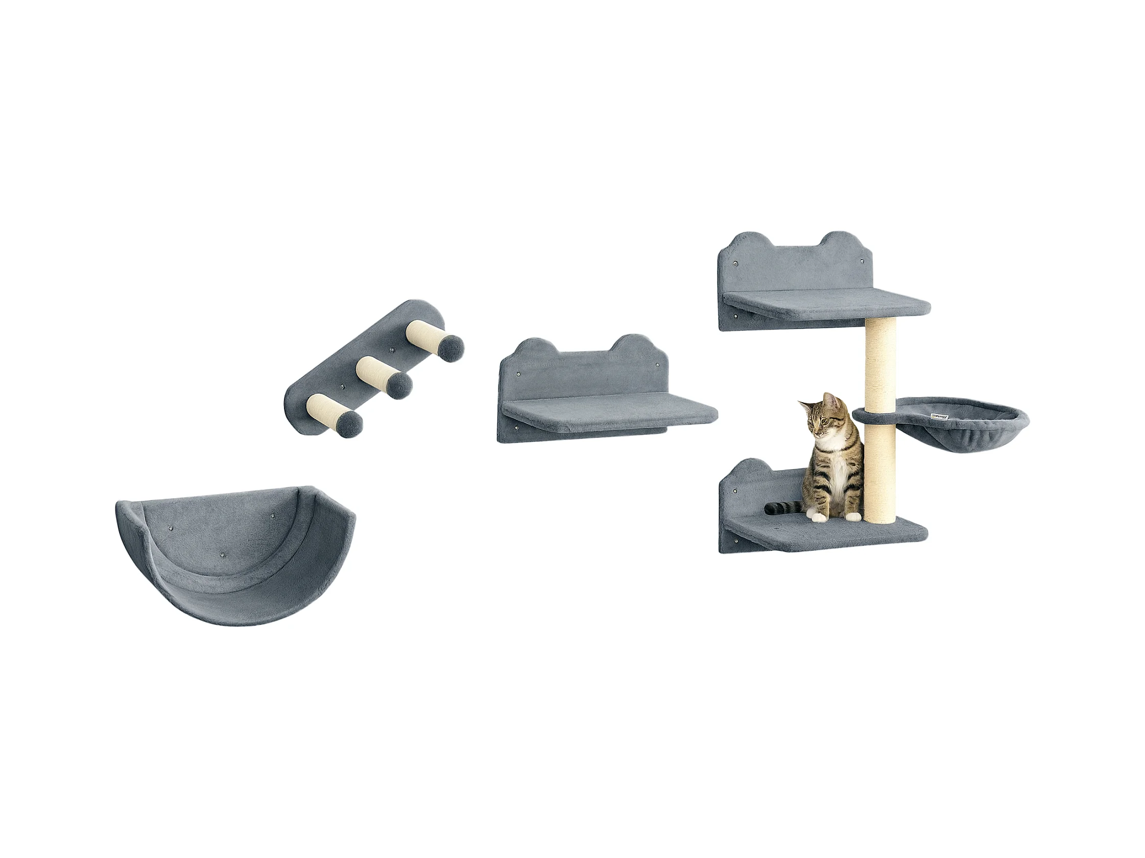 Mur d'escalade pour chat - arbre à chat design mural - griffoirs, plateformes, panier, hamac, jeux boules - gris