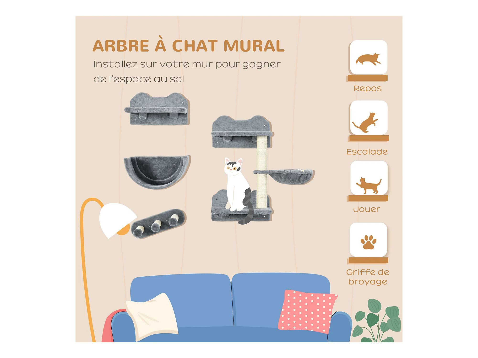 Mur d'escalade pour chat - arbre à chat design mural - griffoirs, plateformes, 2 paniers, échelle - sisal peluche gris