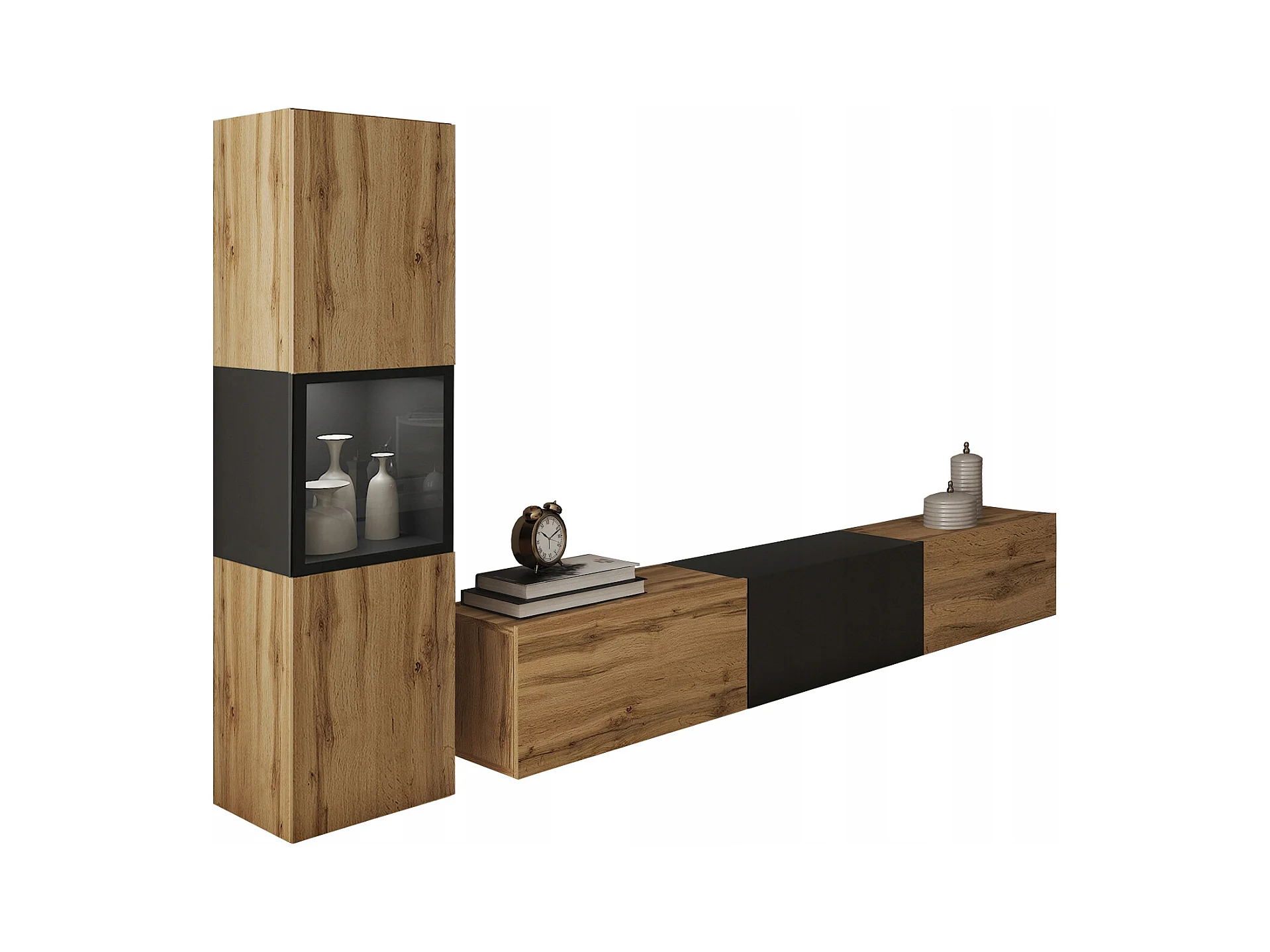 Mur TV de salon avec éclairage, ensemble suspendu et posé 2 éléments avec meuble TV 180 cm et vitrine, corps chêne wotan, insert noir mat