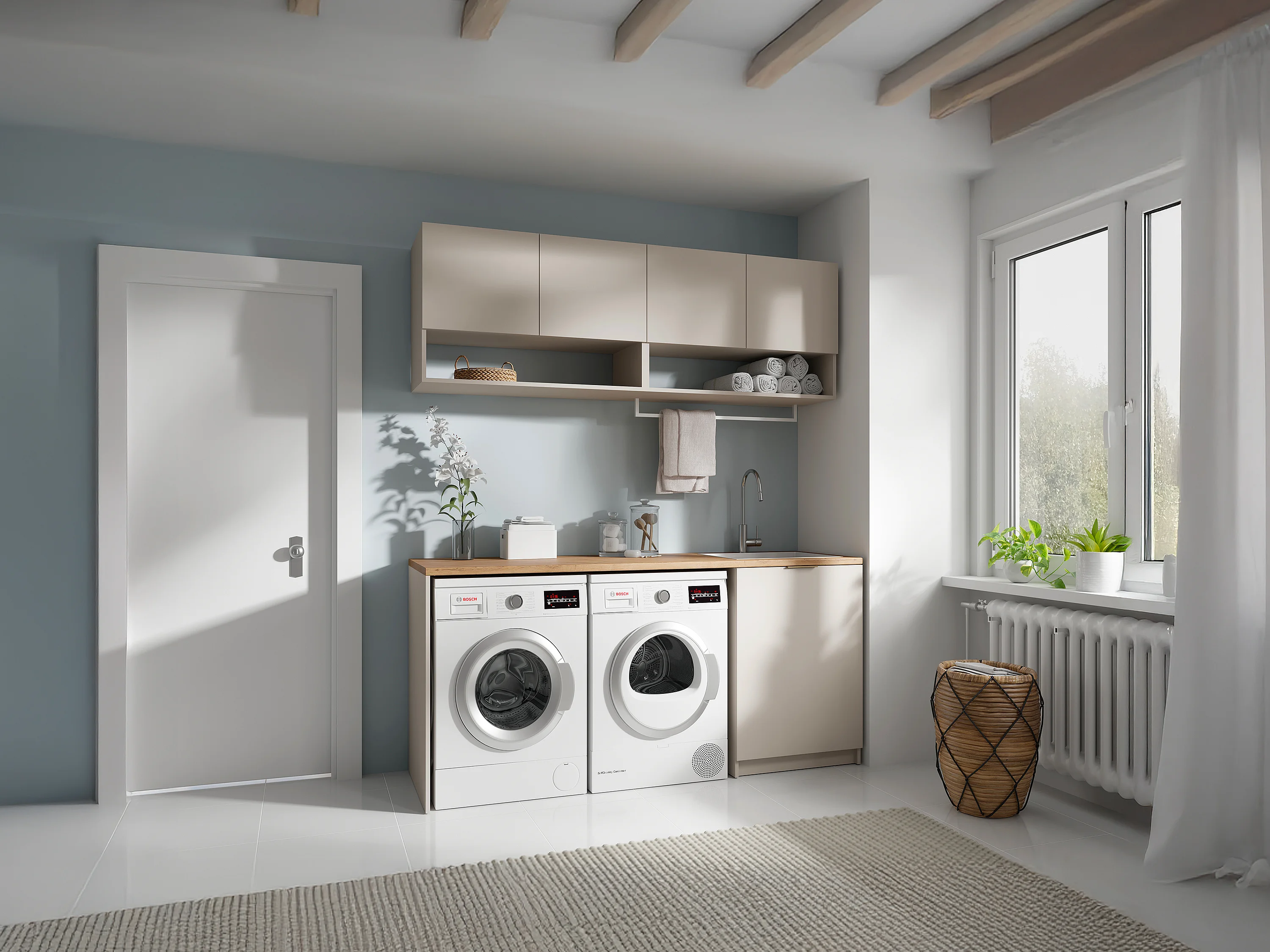 Meubles de buanderie pour machine à laver avec plan de travail - L182 cm - Couleur beige et naturel clair - NATAJI