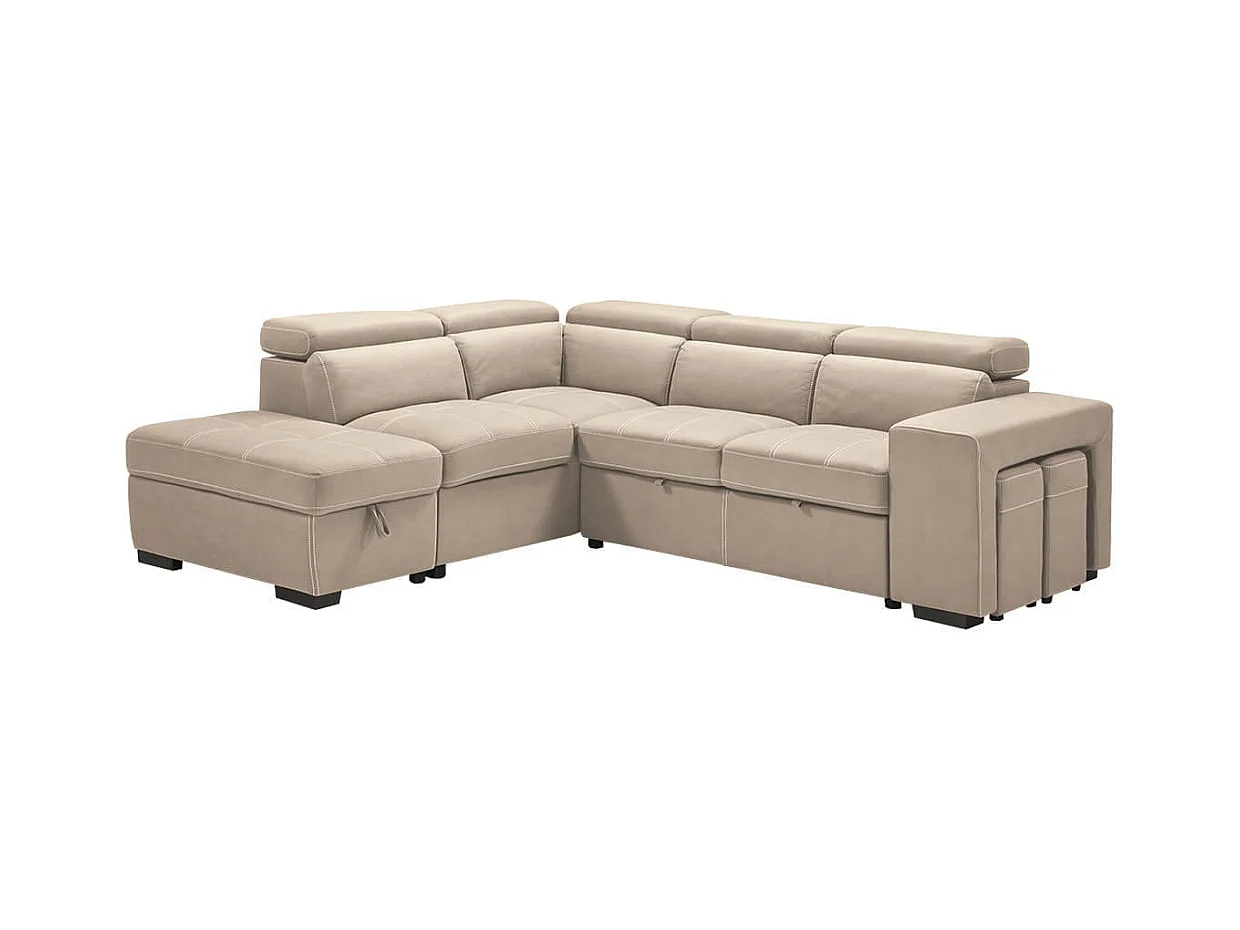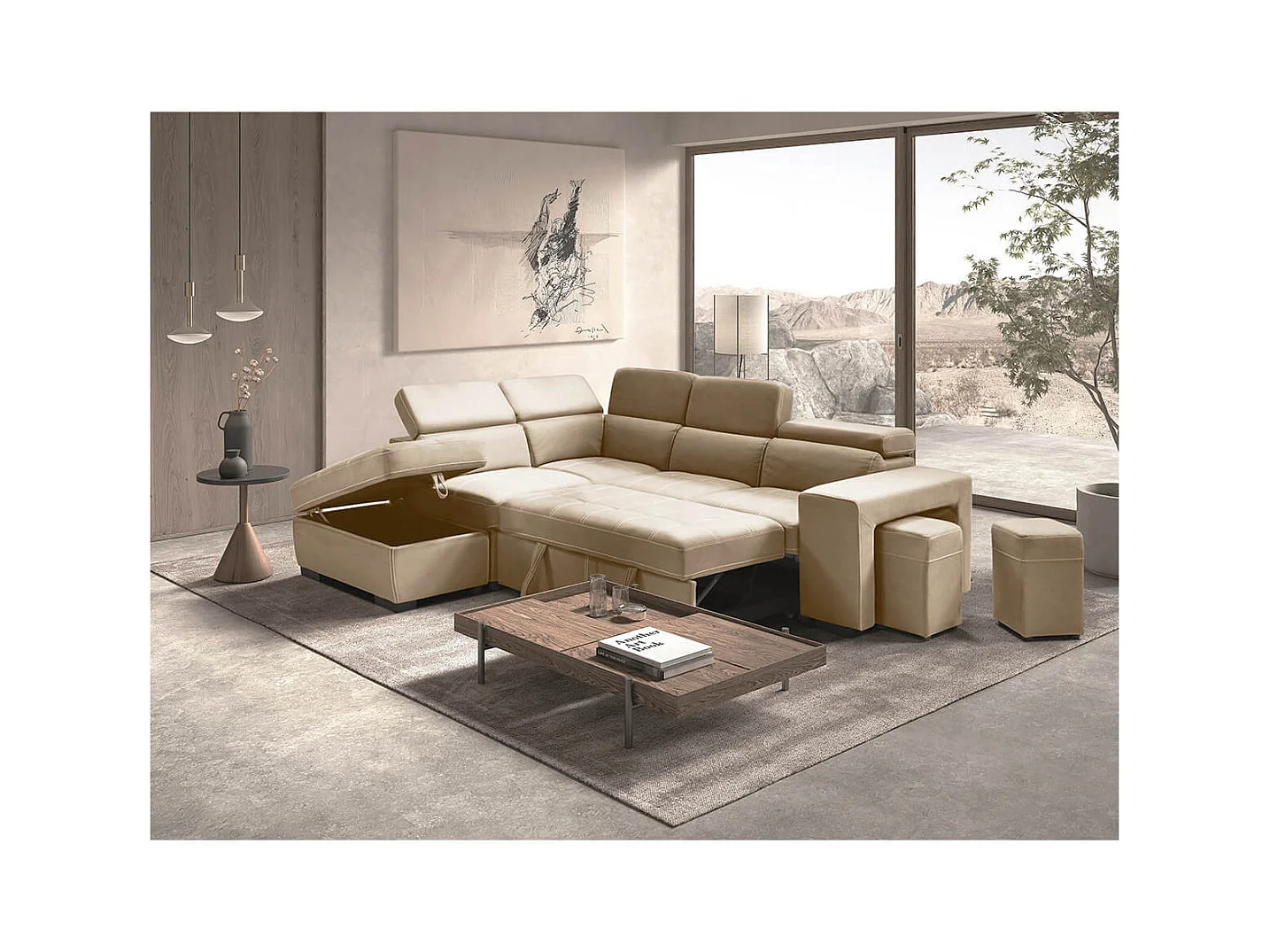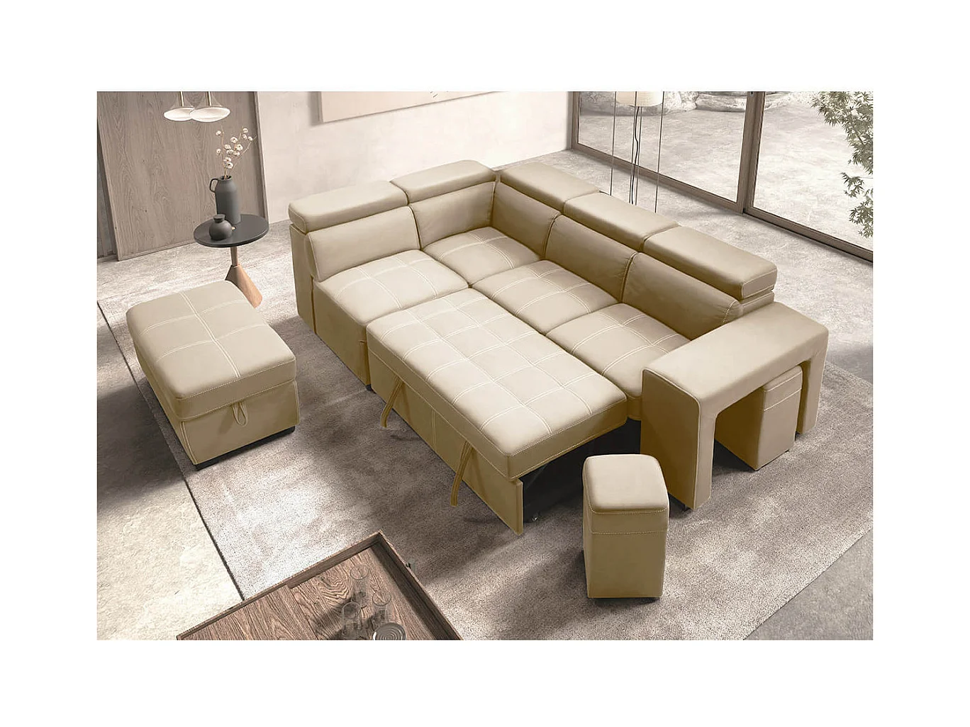 NERA - Canapé d'Angle Gauche Convertible avec 2 Poufs et 1 Coffre Beige