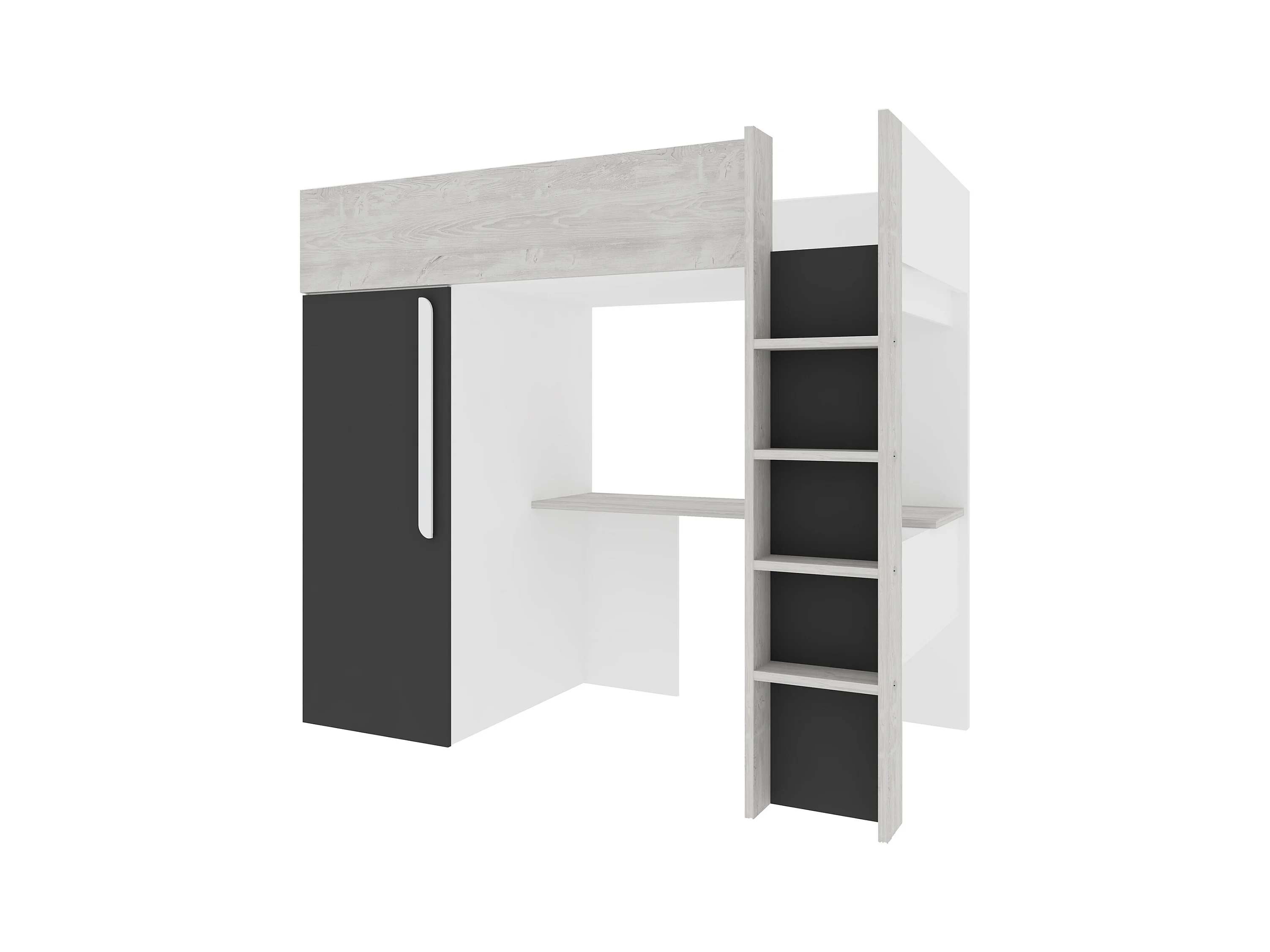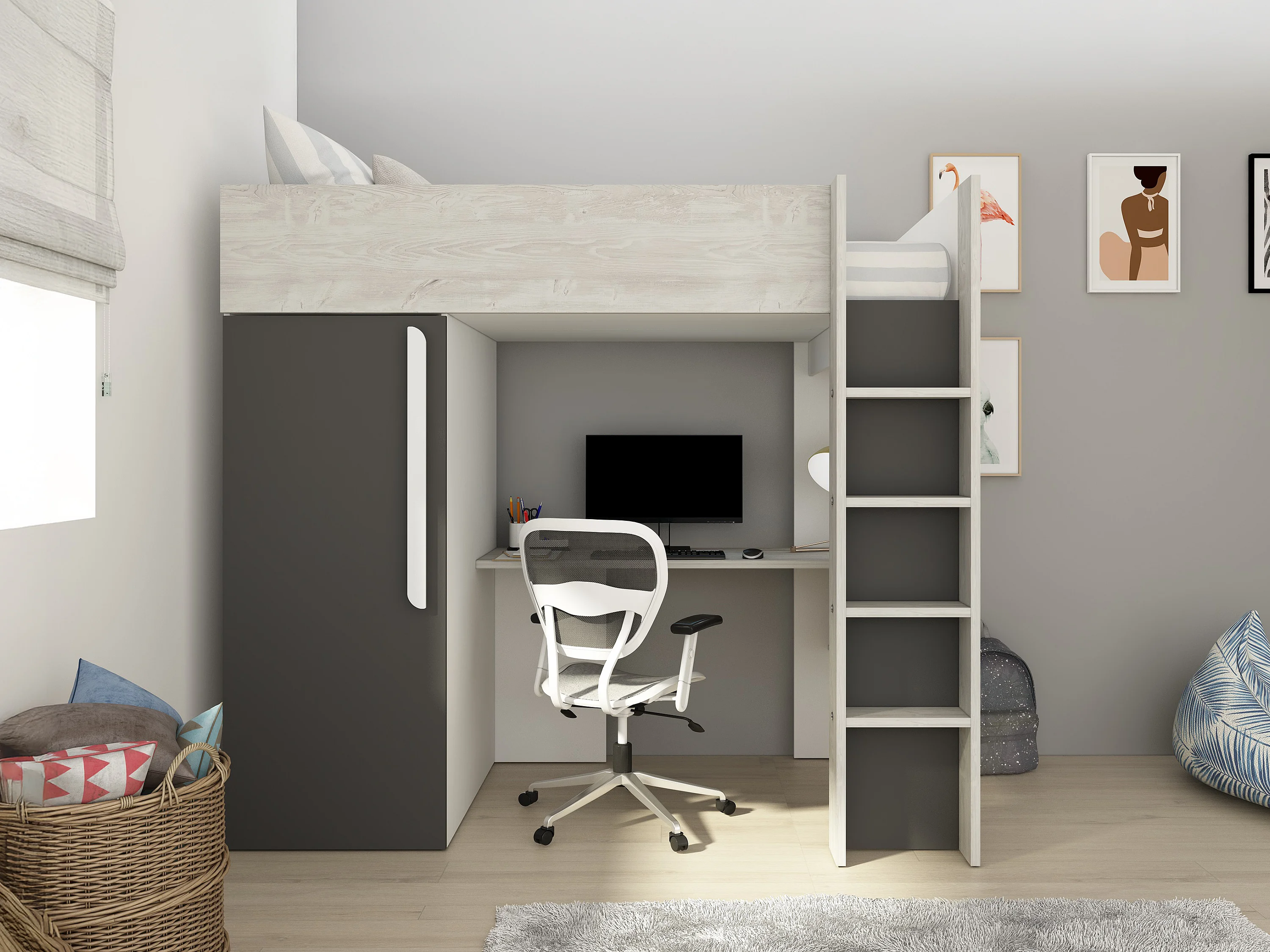 Lit mezzanine 90 x 200 cm avec armoire et bureau – Coloris : Naturel et anthracite - NICOLAS