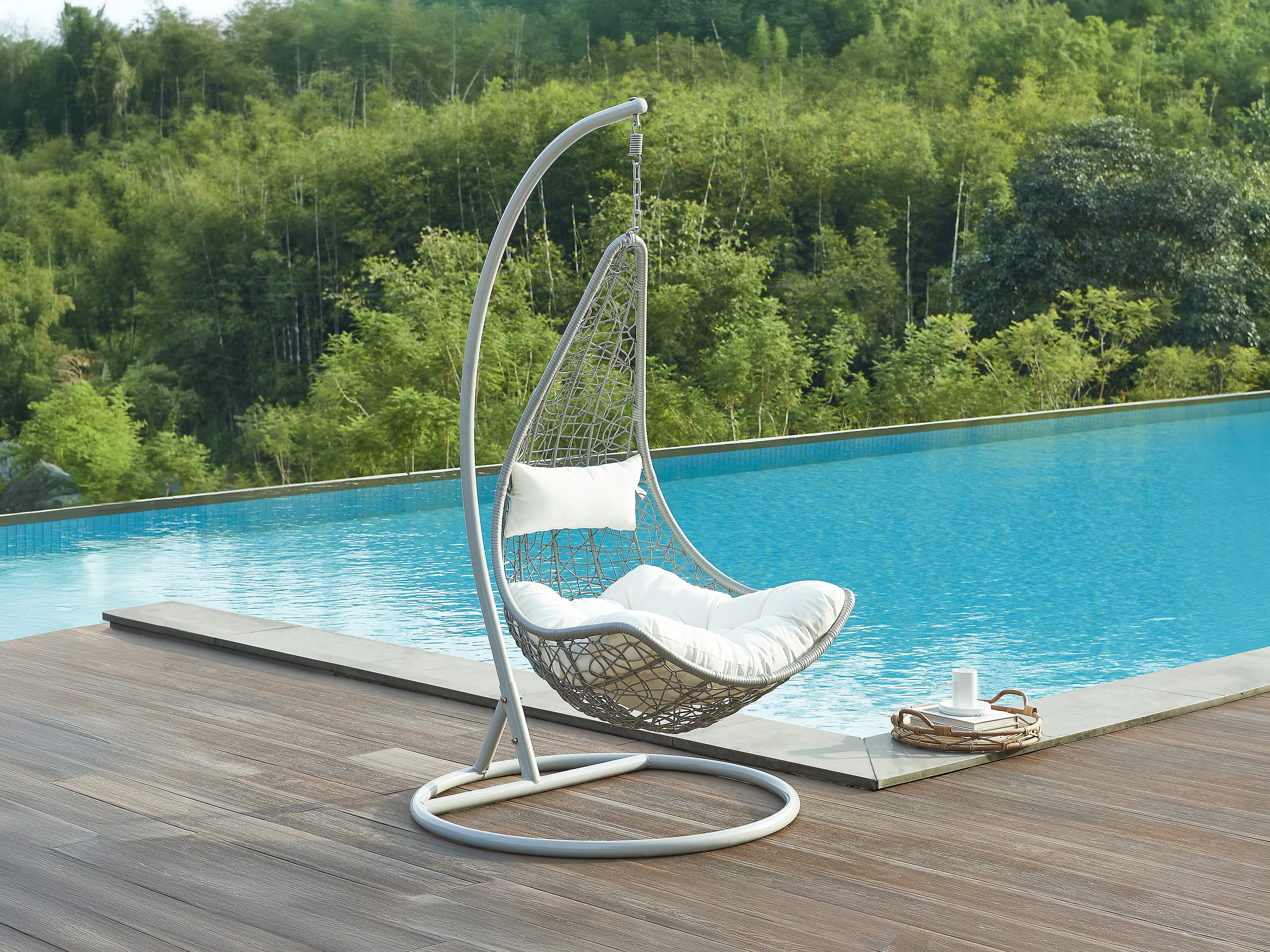 Fauteuil suspendu en résine tressée - Gris clair avec coussins blancs - OROSI de MYLIA