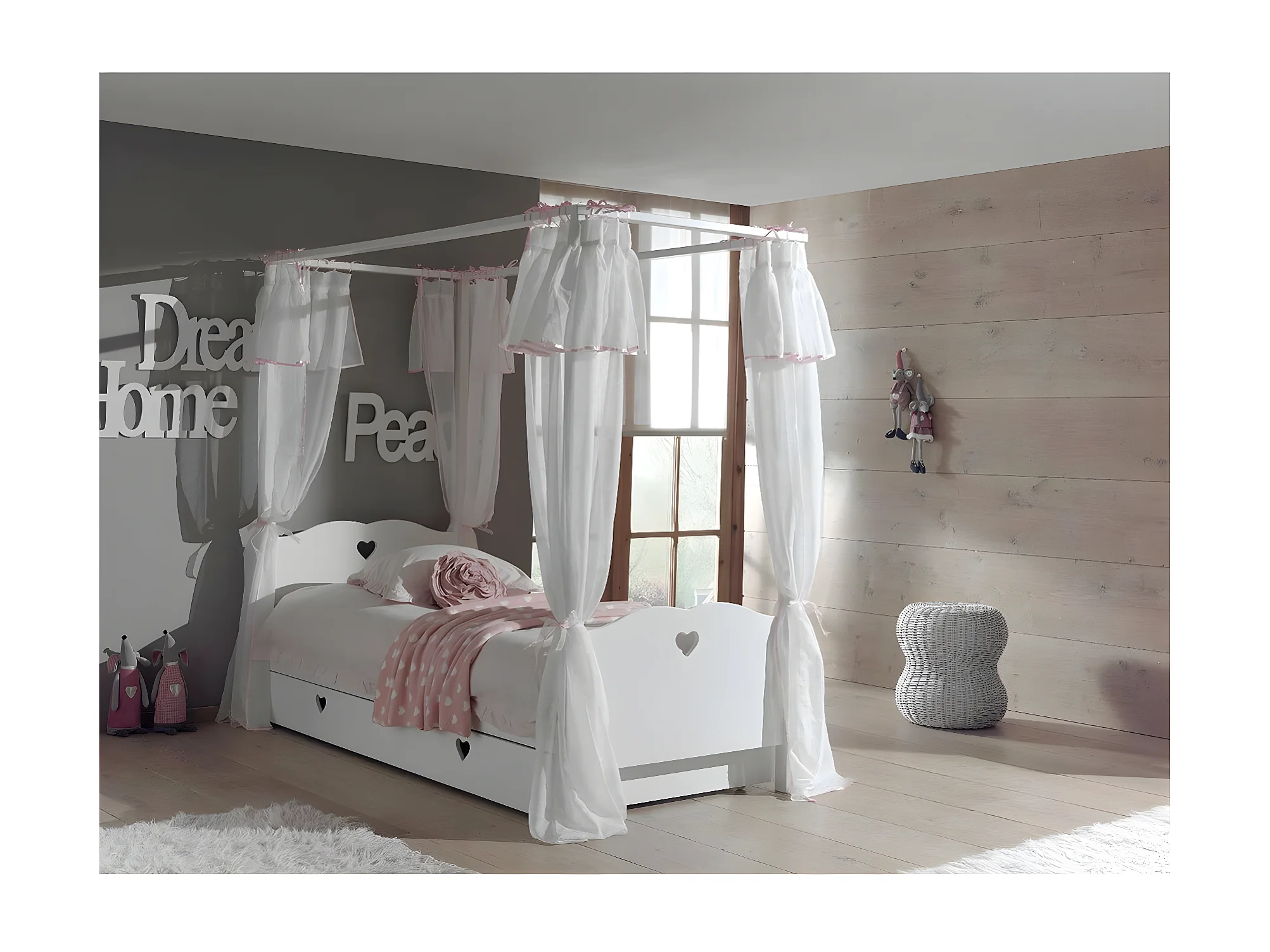 Pack - Lit à Baldaquin Enfant, Sommier, Tiroir & Voile "Amori" 90x200cm Blanc