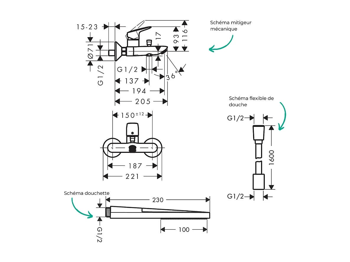 Pack mitigeur bain douche mécanique HANSGROHE Logis + Flexible Designflex + Pommeau HANSGROHE Pulsify E 100 EcoSmart chromé