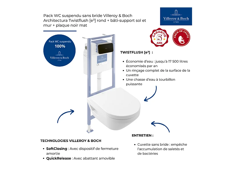Pack WC suspendu sans bride Villeroy & Boch Architectura Twistflush [e³] rond + bâti-support sol et mur + plaque noir
