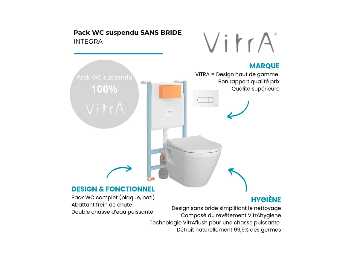 Pack WC suspendu VITRA Integra blanc + bâti mur porteur V-Fix Core + Plaque Round Blanche