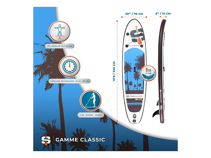Paddle Gonflable UGAL 10'6 30'' 6" (315 x 76 x 15 cm) avec Pagaie, Leash, Pompe et Sac de Transport