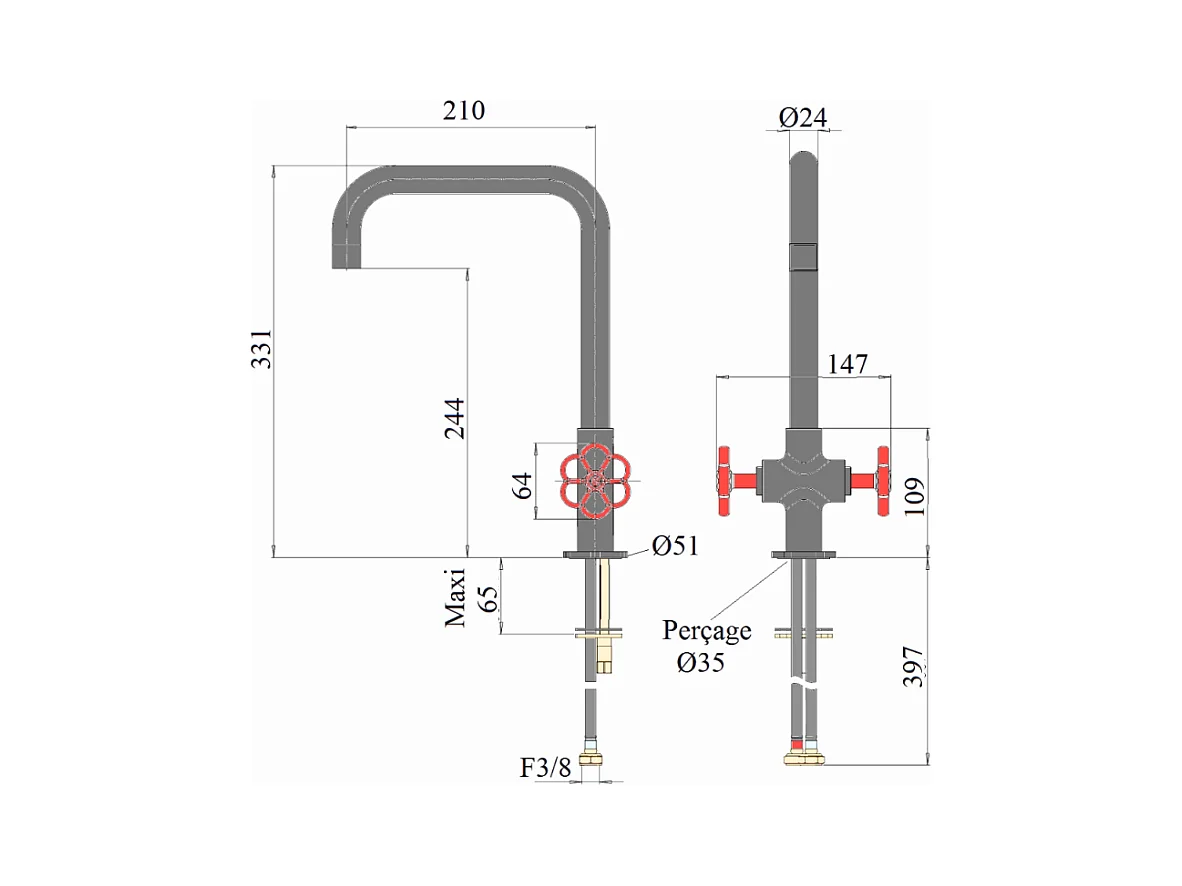 PAINI Mélangeur cuisine Induss Bec haut chrome - manette rouge douchette extractible