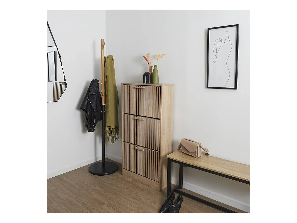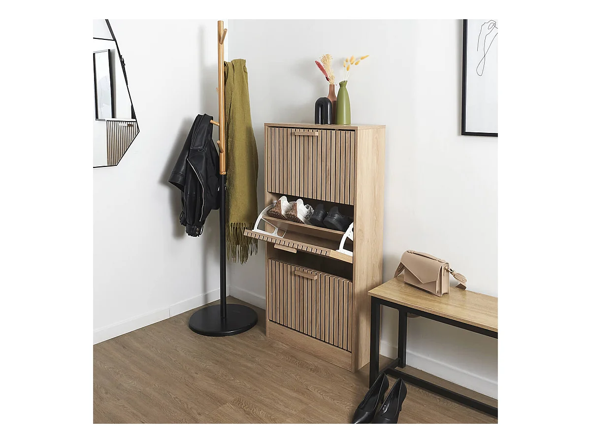 PAJAN - Meuble à Chaussures 3 Portes Basculantes Effet Bois avec Tasseaux