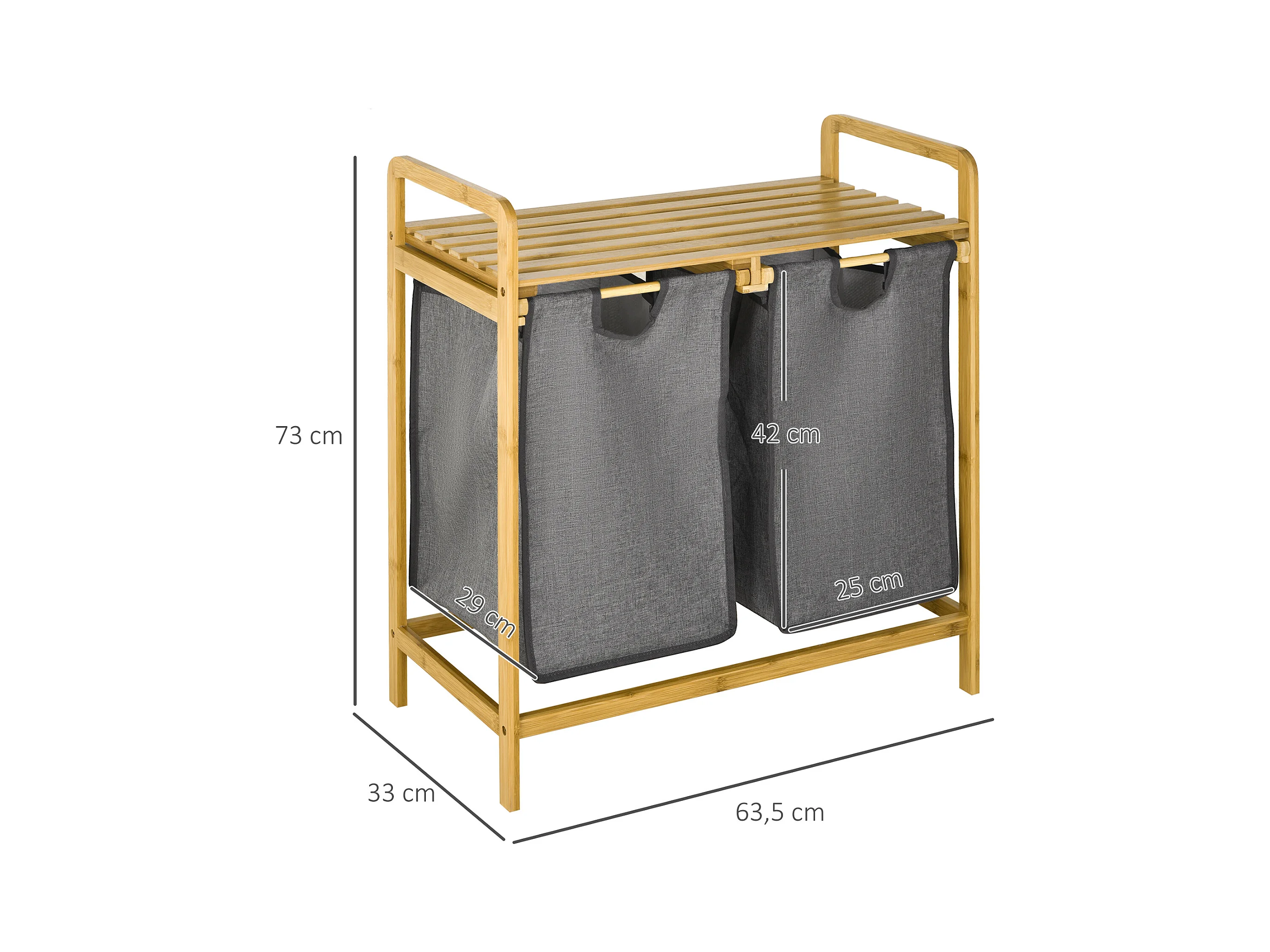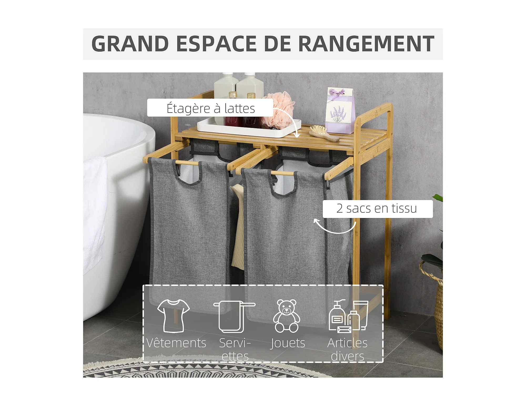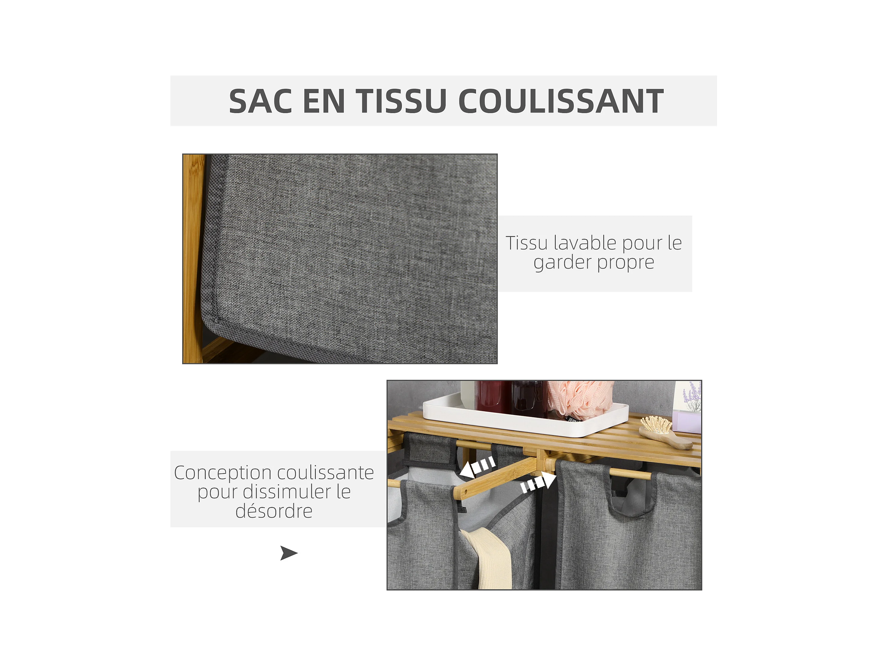 Panier à linge corbeille à linge en bambou 2 paniers amovibles non-tissé gris foncé