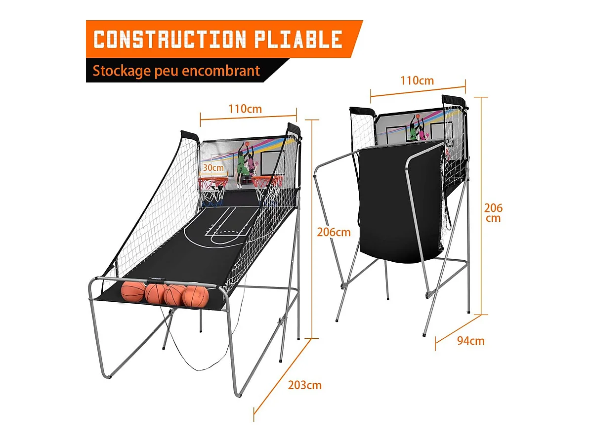 Panier de Basketball Pliable Jeu de Basketball Arcade Double Panier et 4 Ballons Score Electronique 202x107x205cm