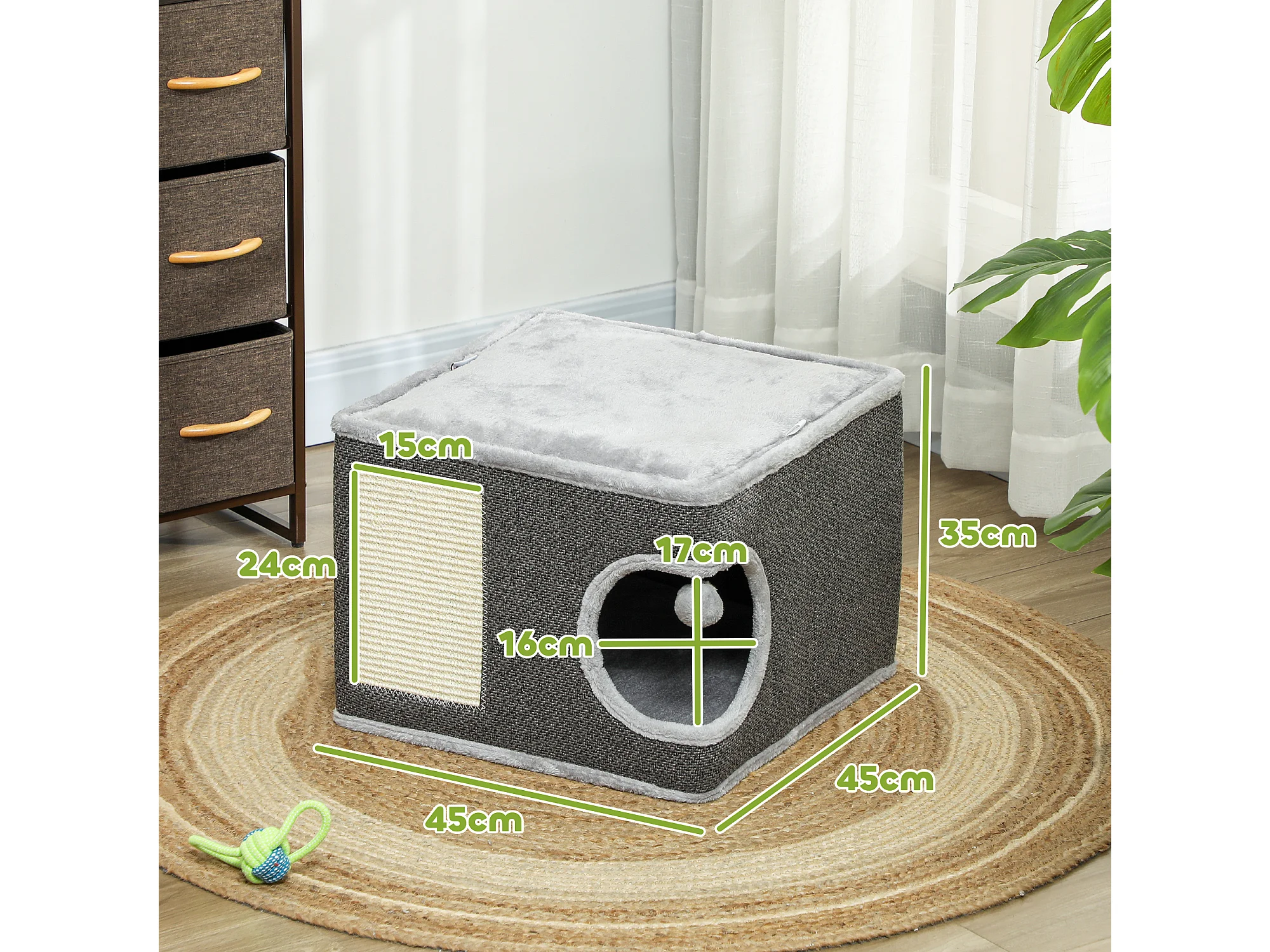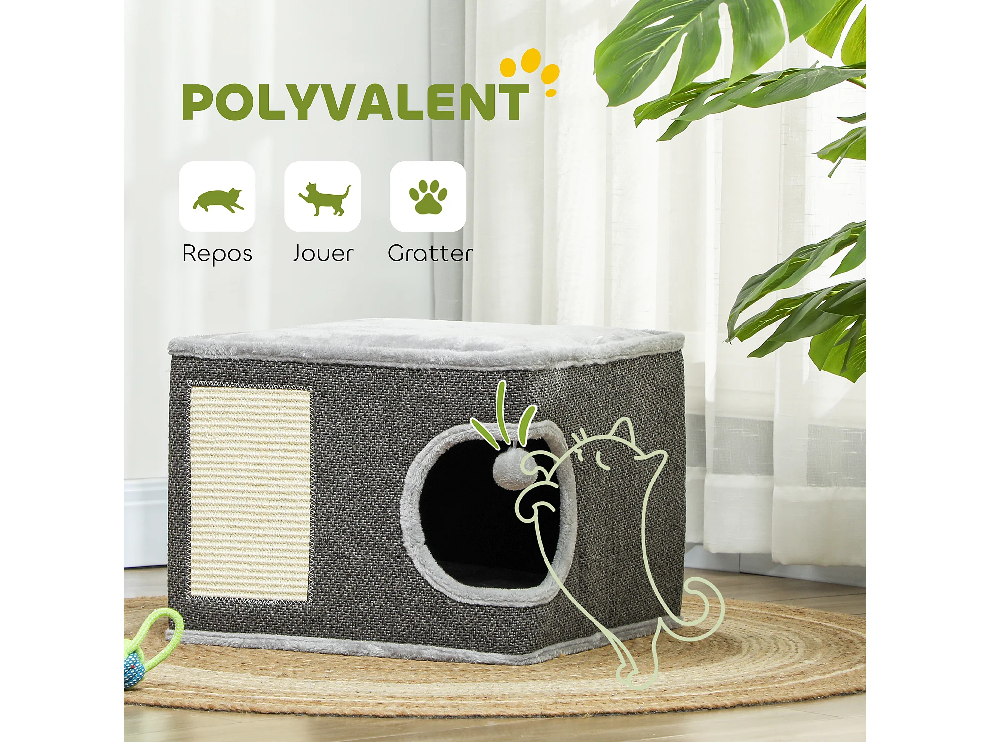 Panier niche griffoir grattoir 4 en 1 - 2 coussins, pompon - sisal naturel peluche gris