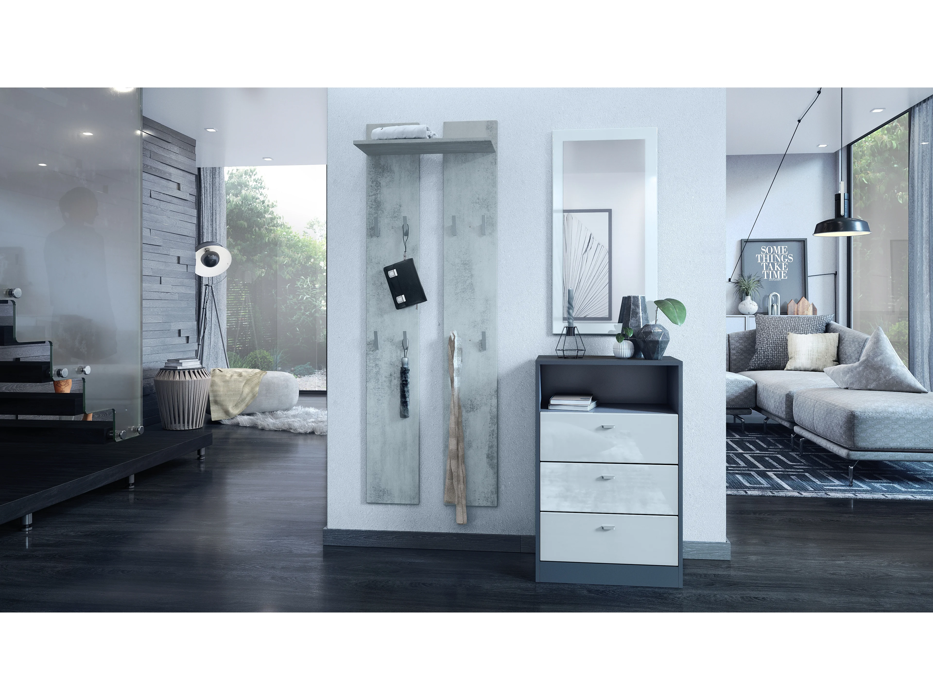 Ensemble d'entrée Hollywood, comprenant 1 panneau de vestiaire mural, 1 tringle à vêtements et 1 ensemble de panneaux muraux, anthracite mat/aspect béton oxyde