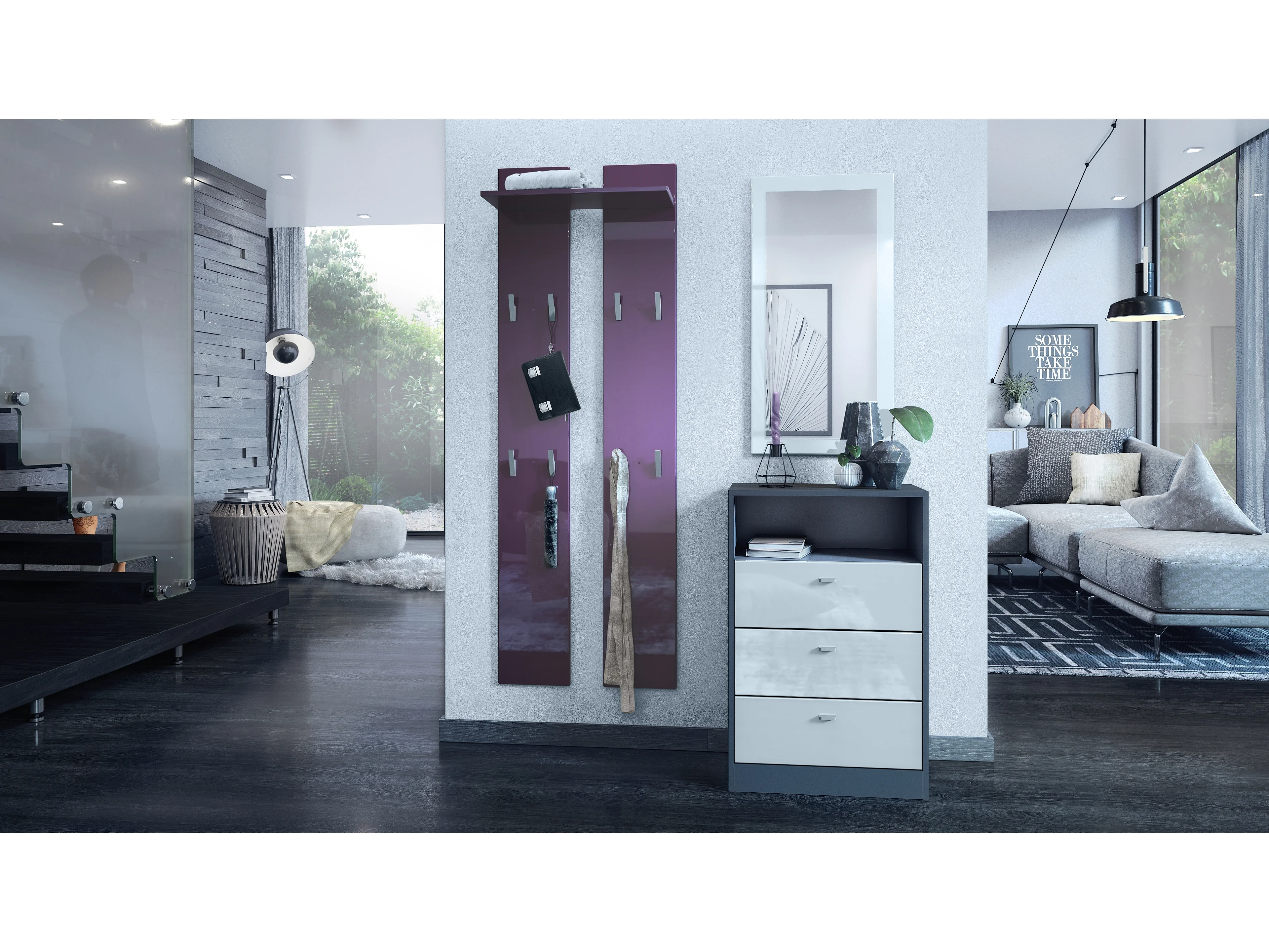 Penderie Malea, Meuble d’entrée comprenant 1 commode à chaussures, 1 miroir et 2 panneaux porte-manteaux, Anthracite mat/Mûre brillant, LED blanc inclus