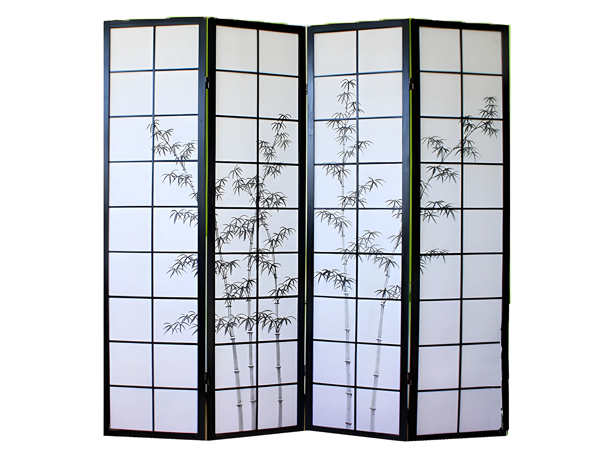 Paravent japonais en bois noir dessin bambou de 4 pans