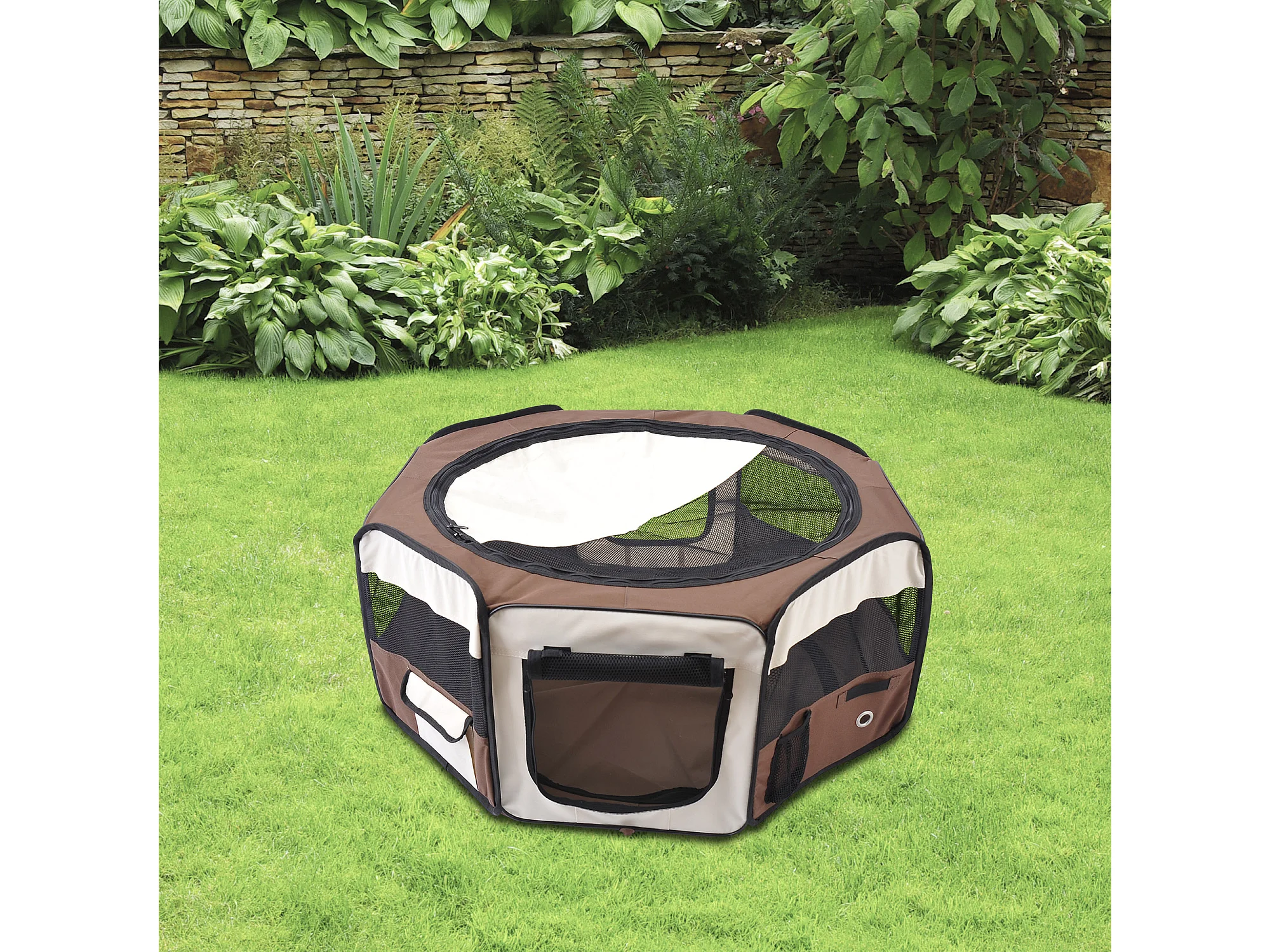 Parc enclos pliable chien chat Ø 117 x 76H cm - 2 portes, 2 poches, sac transport - acier Oxford marron beige