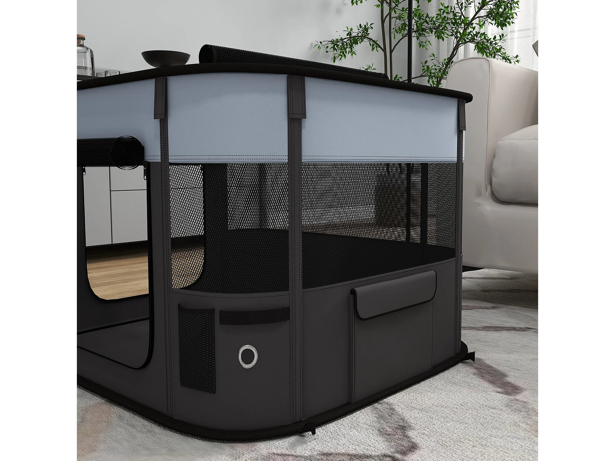 Parc pour chiots et petits animaux avec portes et fenêtres, pliable, en polyester respirant, gris (74x60x45cm)