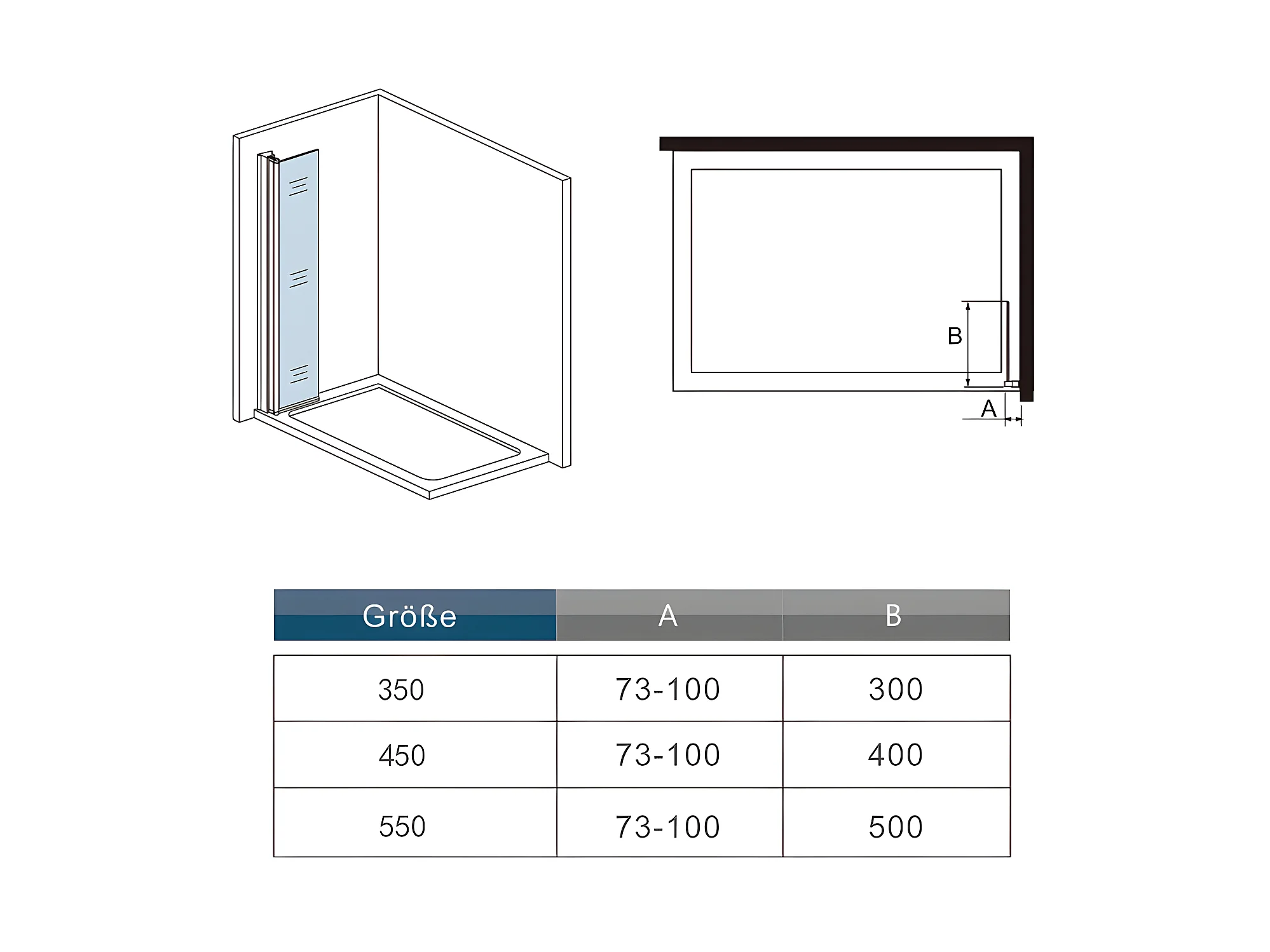Paroi de douche fixe à l'italienne 70+30x200cm avec retour pivotant - Noir - avec barre de fixation 73-120cm en carré