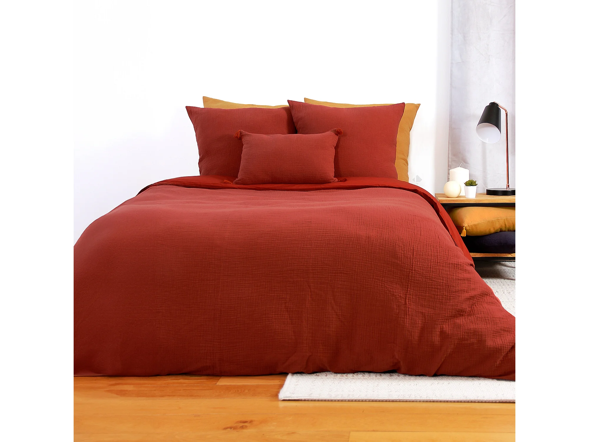 Parure de lit 240x220 cm double gaze de coton GAZGAZ rouge ocre 3 pièces
