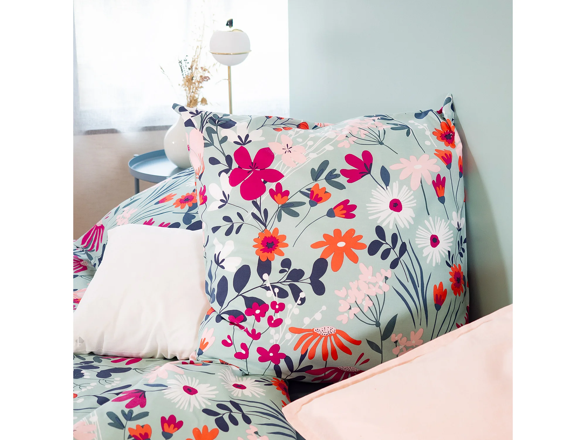 Parure de lit 260x240 cm coton biologique FLORE Bleu 3 pièces