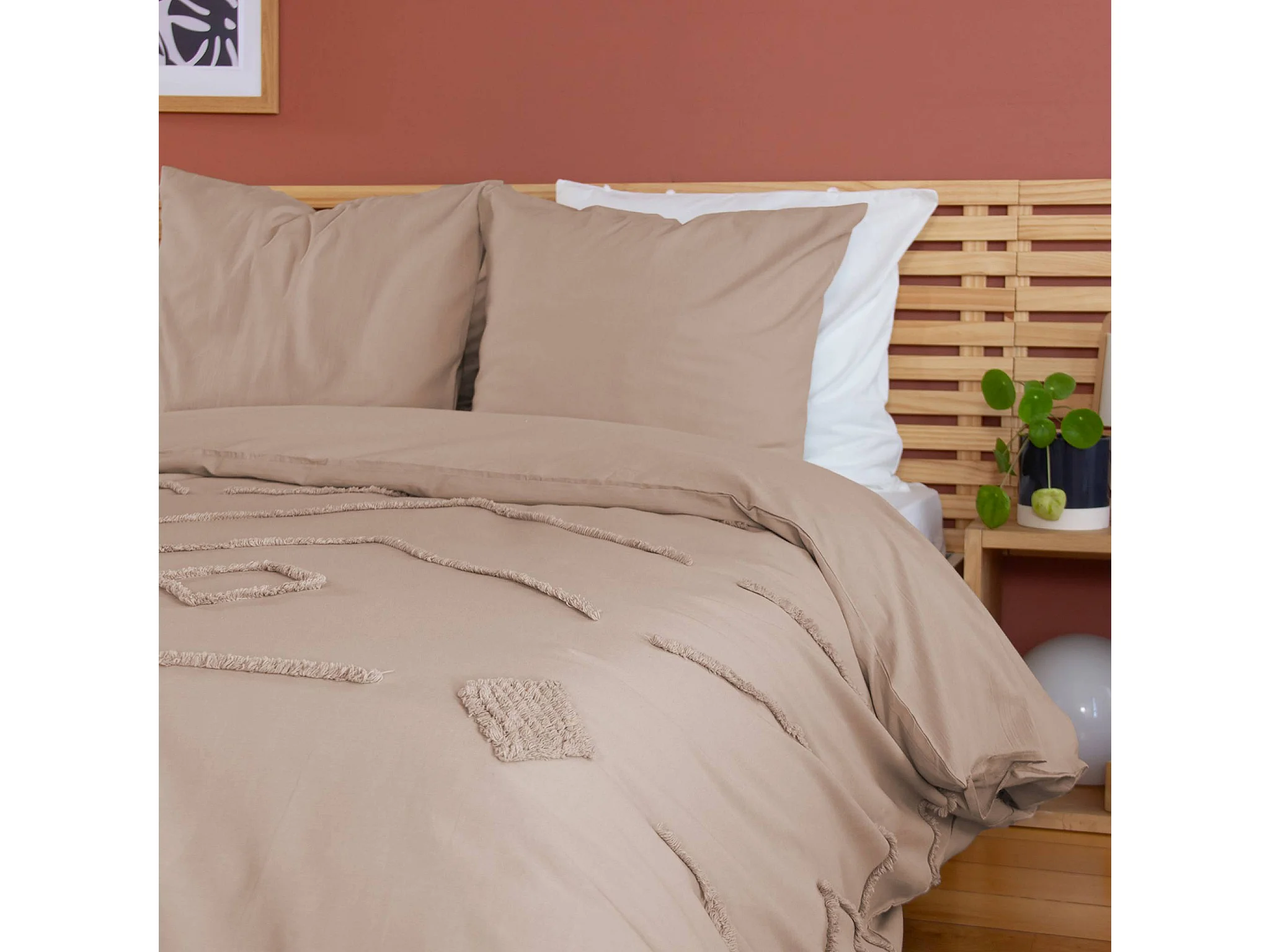 Parure de lit coton lavé tufté 2 places rose poudré motifs géométriques. 1 housse 260x240cm + 2 taies 63x63cm