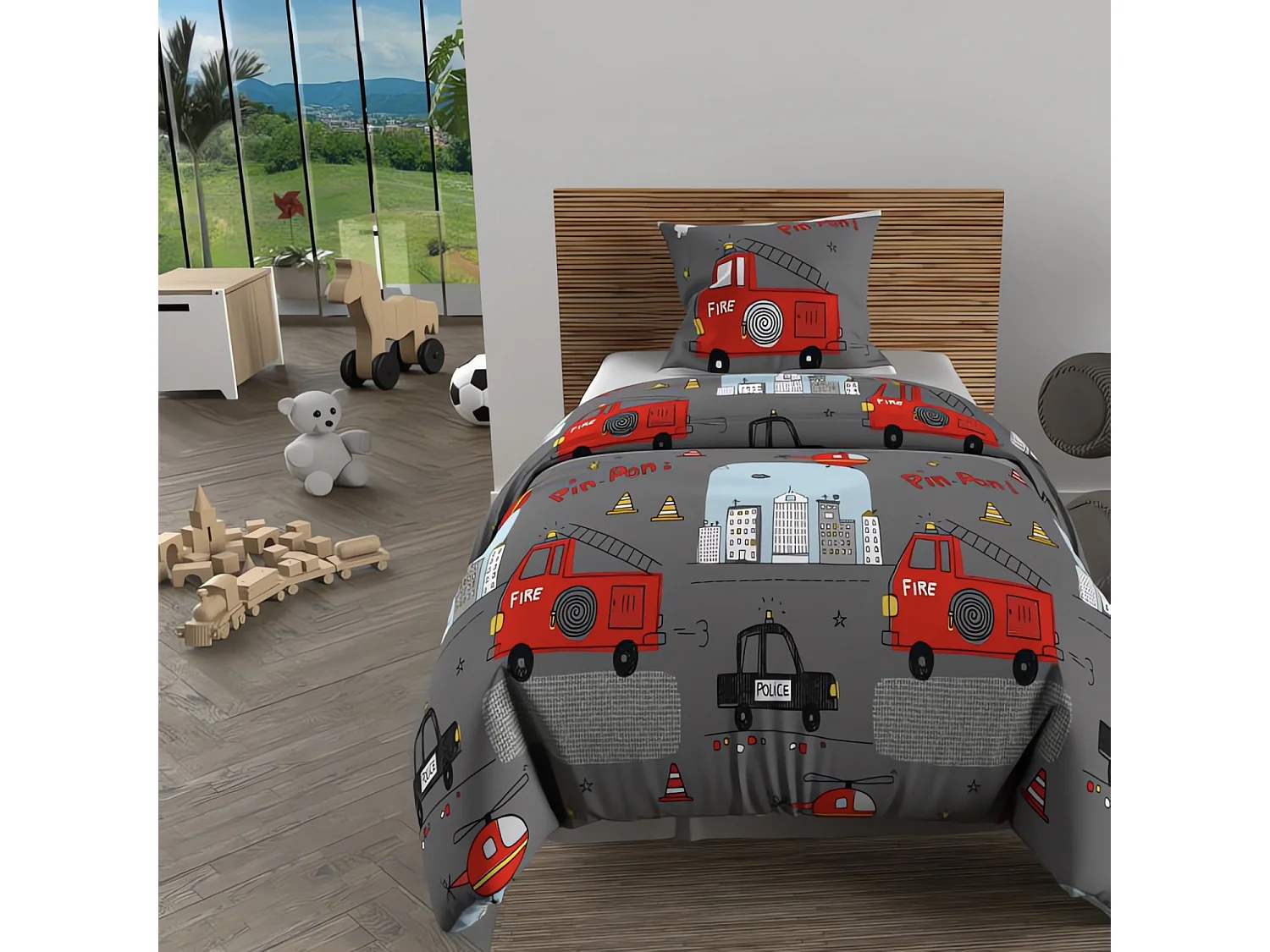 Parure housse de couette 140x200 cm POMPIERS gris, 100% coton 57 fils/cm2, par Soleil d'Ocre