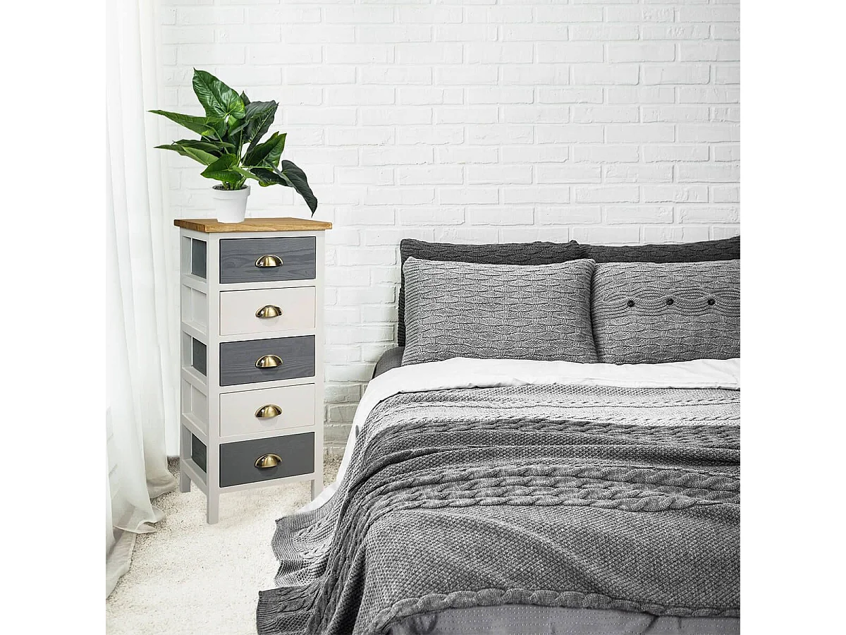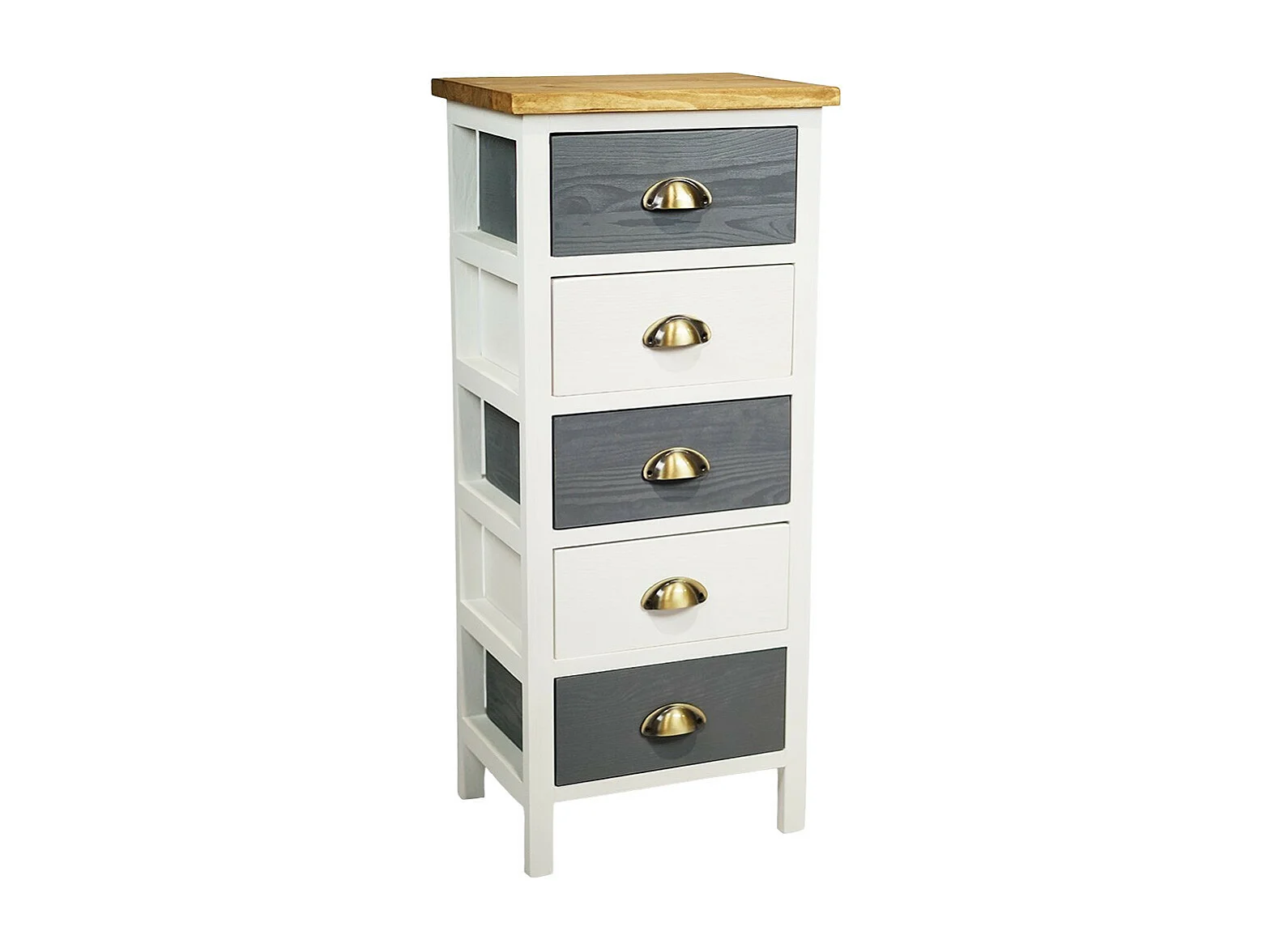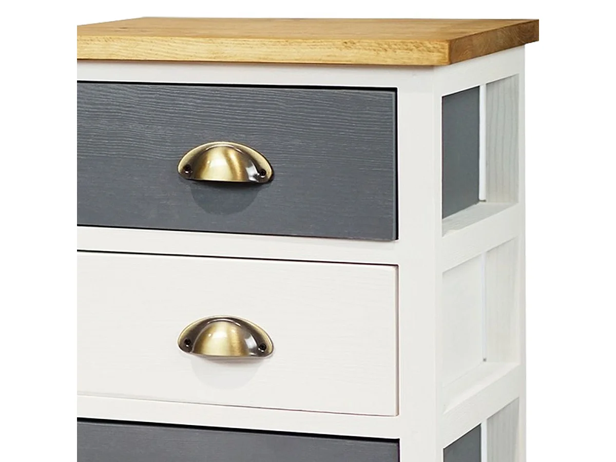 PATTY - Meuble de Rangement 5 Tiroirs en Pin Teinté Gris et Blanc Plateau Naturel