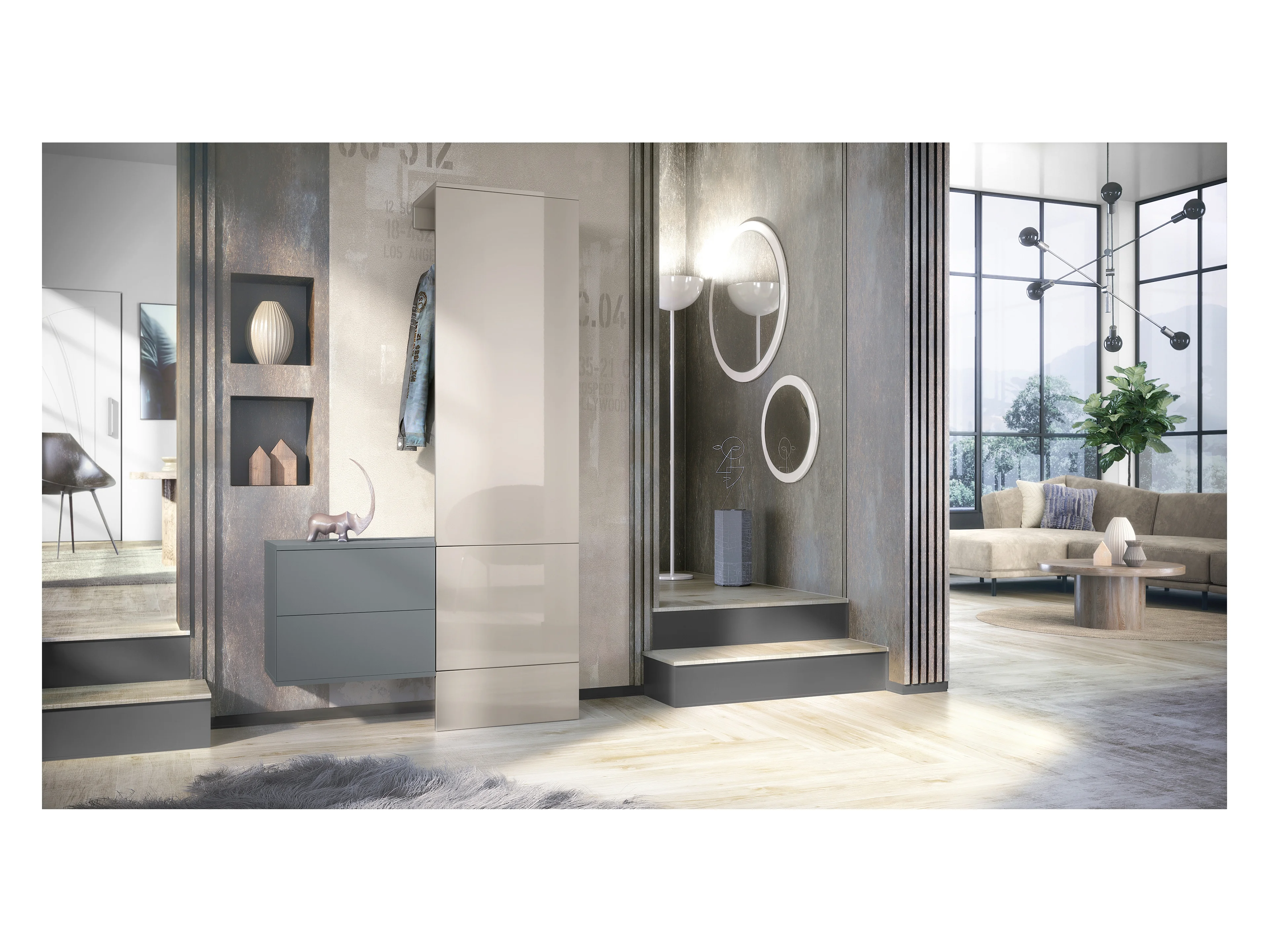 Penderie Carlton Set 2, Meuble d’entrée comprenant 1 panneau porte-manteau, 1 coffre à tiroir, anthracite mat/gris sable haute brillance (105 x 193 x 35 cm)