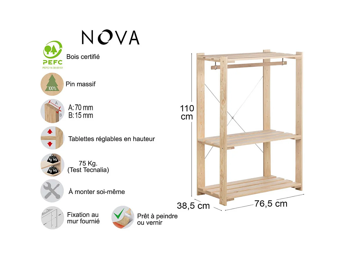 Penderie en pin massif Nova 76.5 x 38.5 x 110 cm