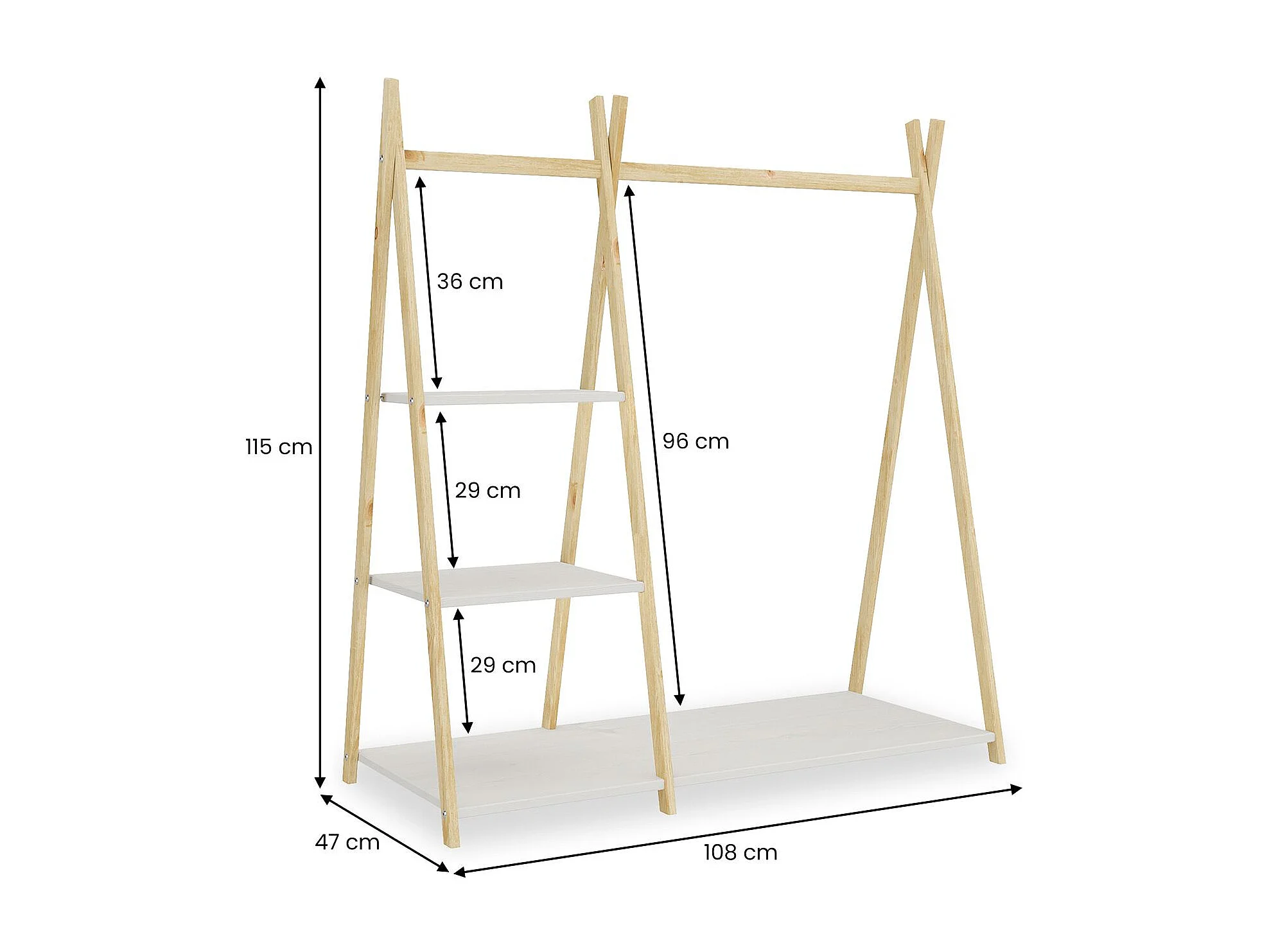 Étagère à vêtement enfant SALLY, garde-robe en pin massif montessori avec 3 étagères, penderie en bois couleur naturelle et blanc