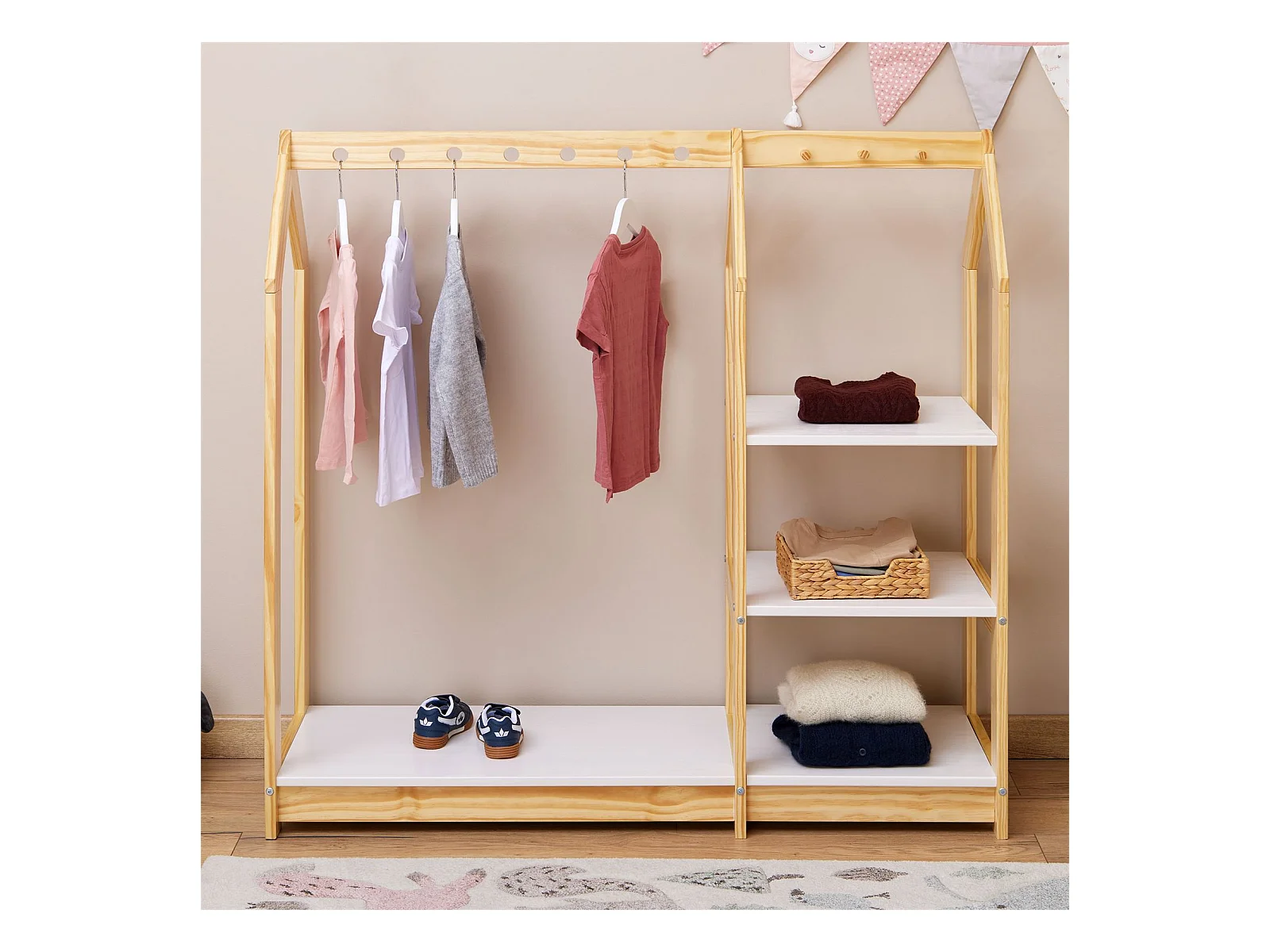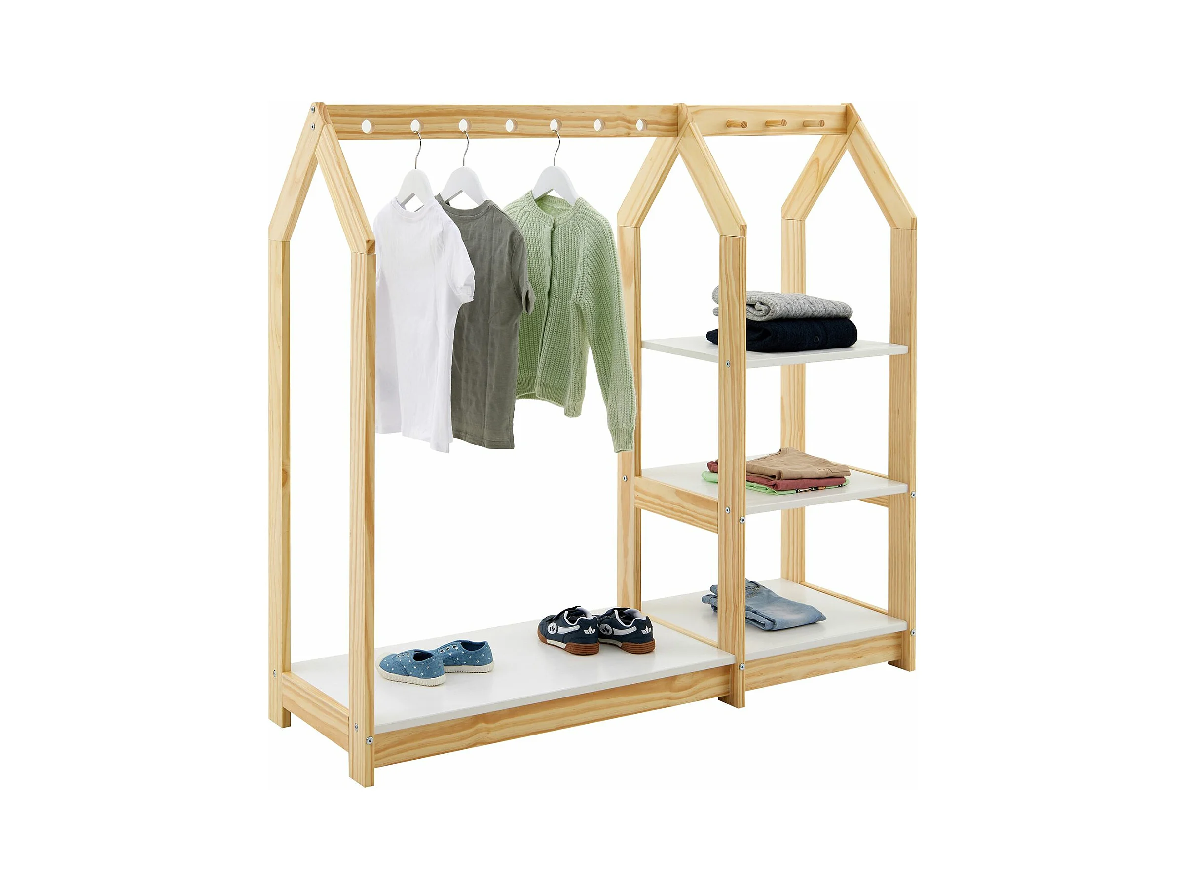 Étagère à vêtement enfant SALLY, garde-robe en pin massif montessori avec 3 étagères, penderie en bois couleur naturelle et blanc