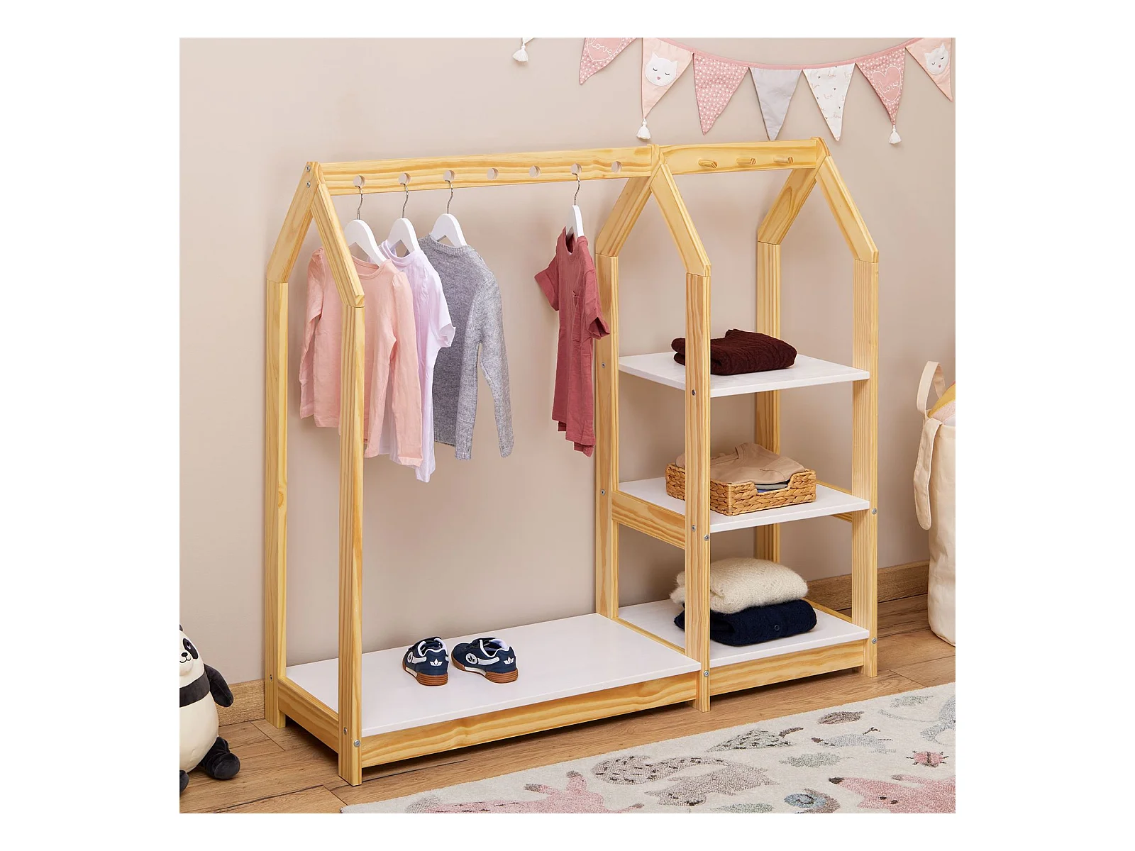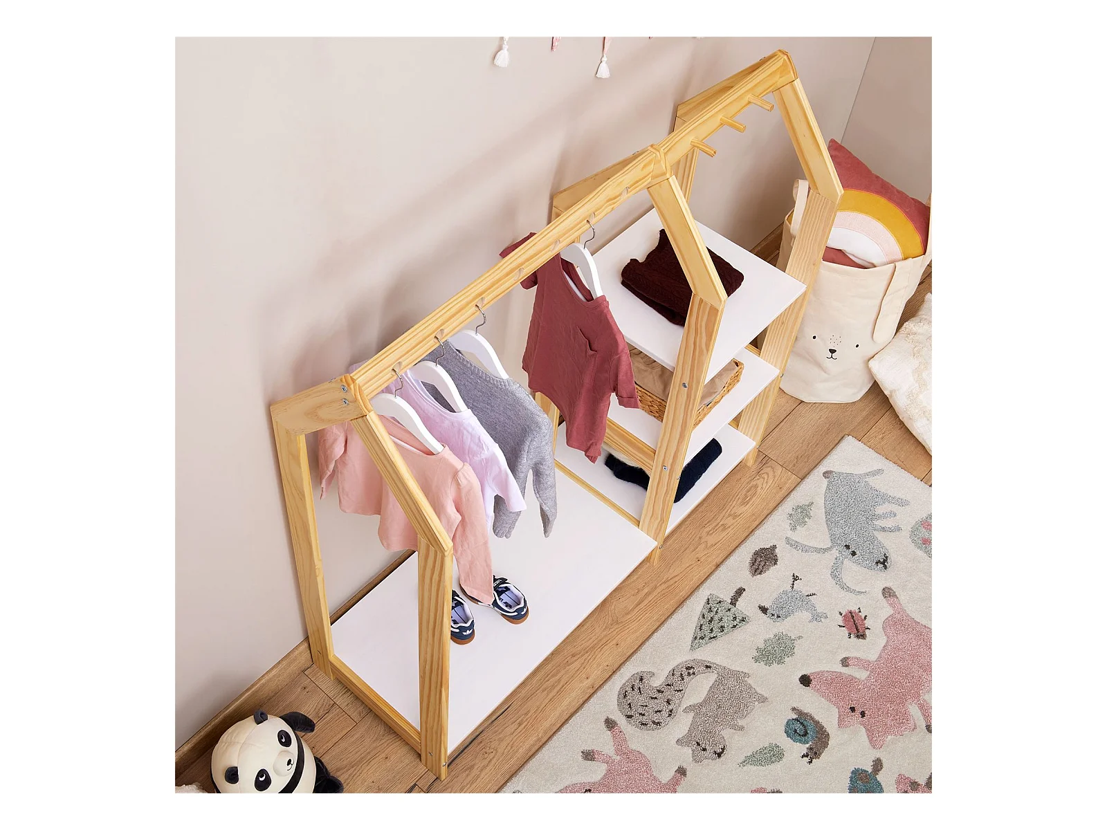 Penderie enfant DANILO avec tringle à vêtements et deux étagères, design tipi, en bois massif, 83 x 115 x 50 cm, coloris naturel