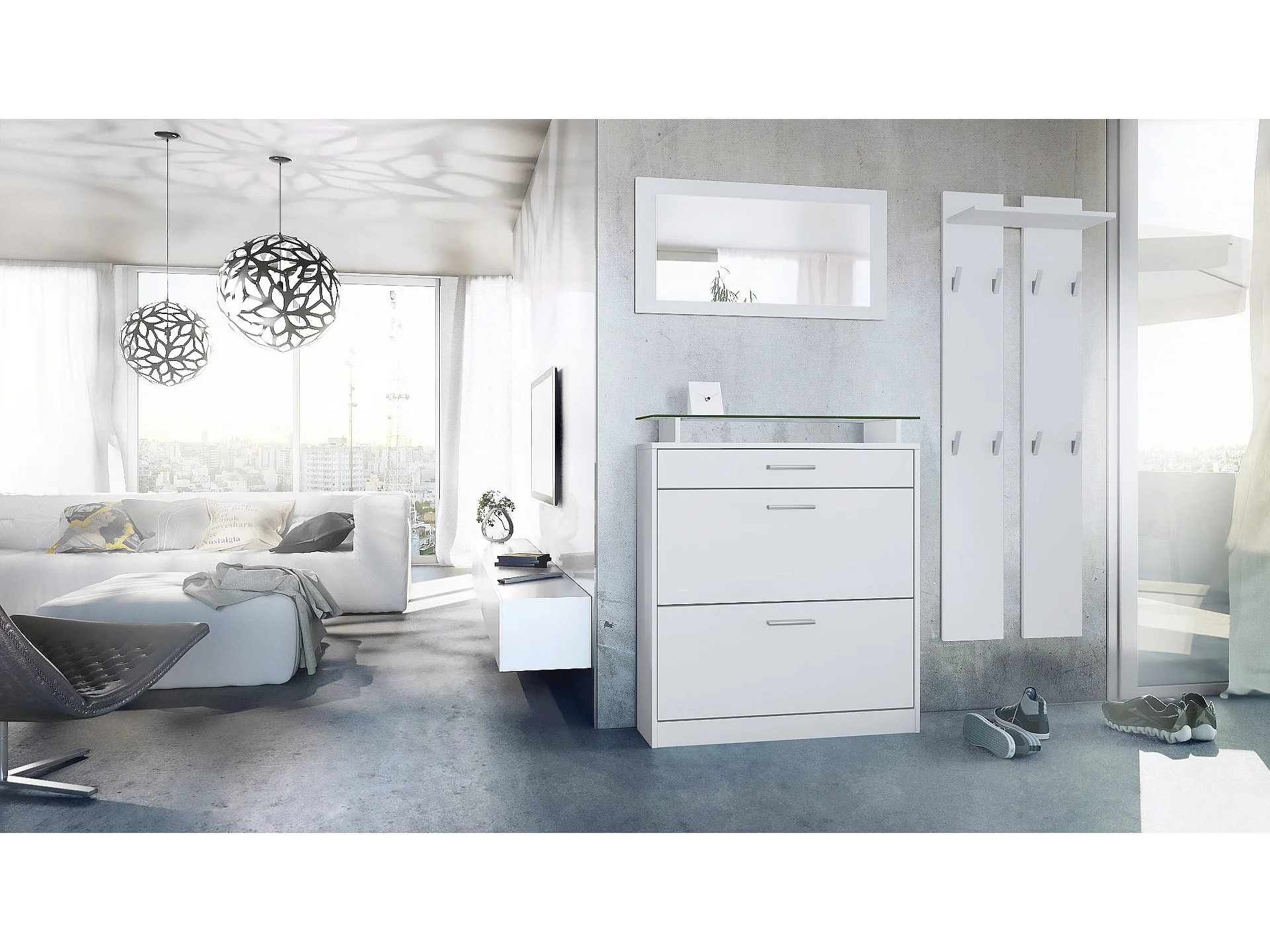 Penderie Loret Mini, Meuble d’entrée comprenant 1 commode à chaussures, 1 miroir mural et 2 panneaux porte-manteaux, Blanc mat/Blanc mat