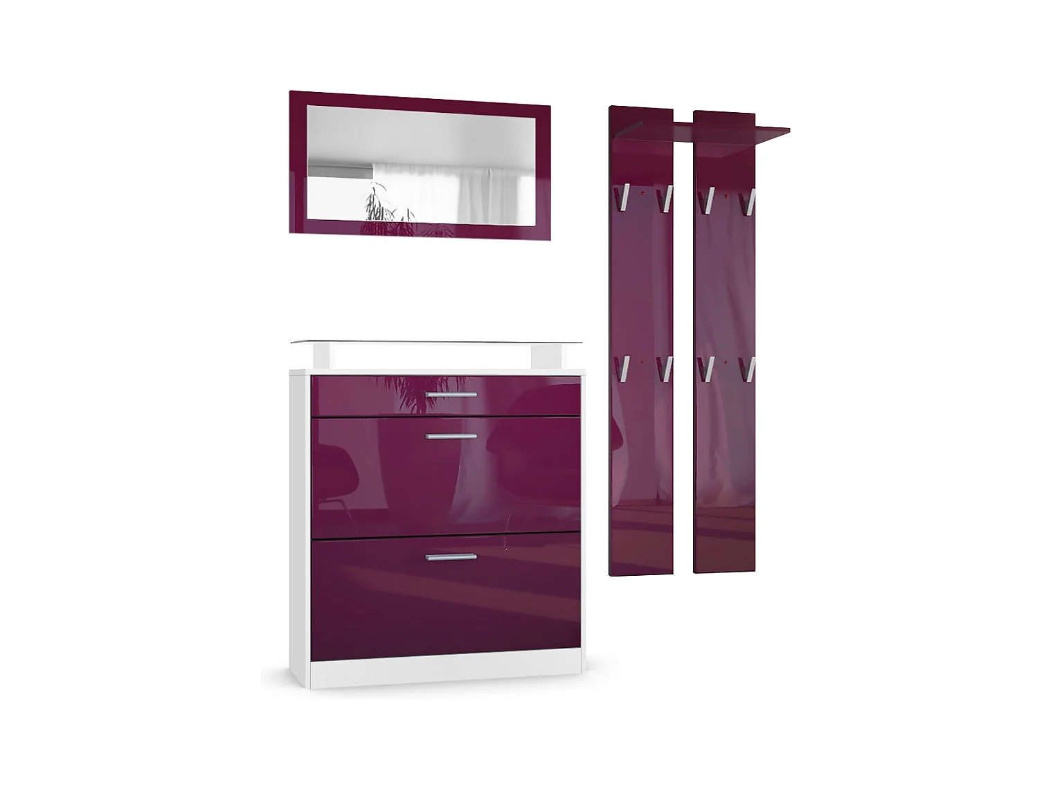 Penderie Loret Mini, Meuble d’entrée comprenant 1 commode à chaussures, 1 miroir mural et 2 panneaux porte-manteaux, Blanc mat/Mûre haute brillance