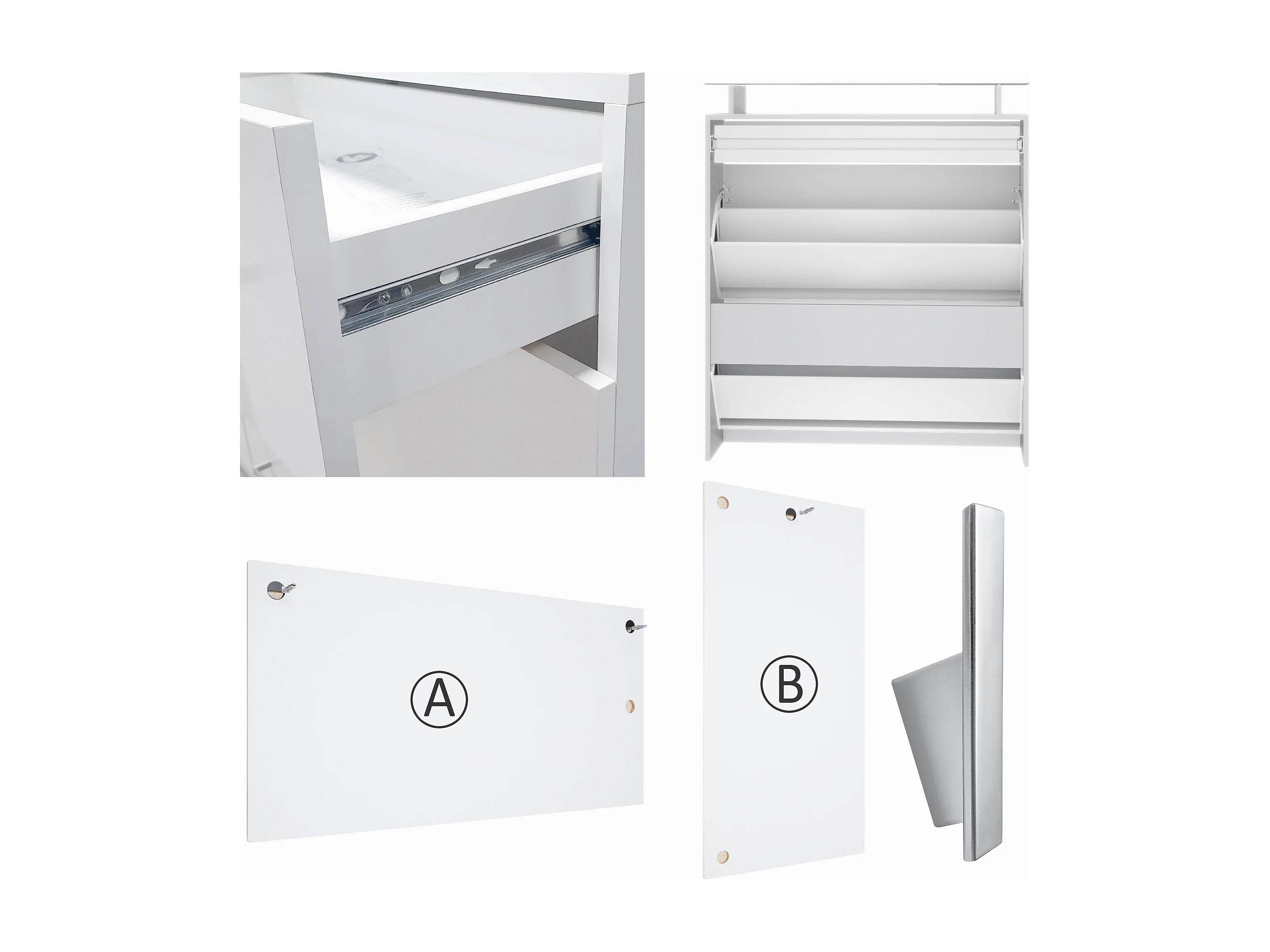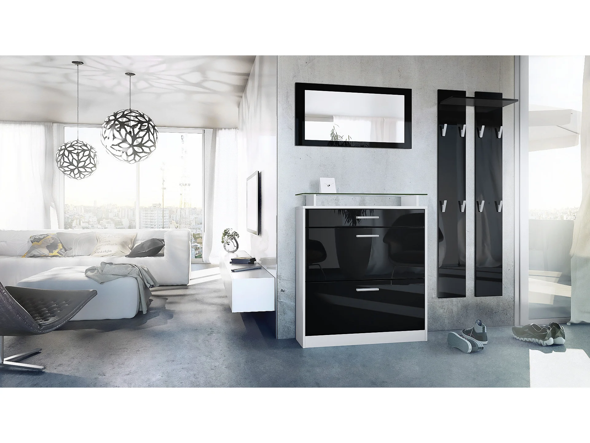 Penderie Loret Mini, Meuble d’entrée comprenant 1 commode à chaussures, 1 miroir mural et 2 panneaux porte-manteaux, Blanc mat/Noir haute brillance