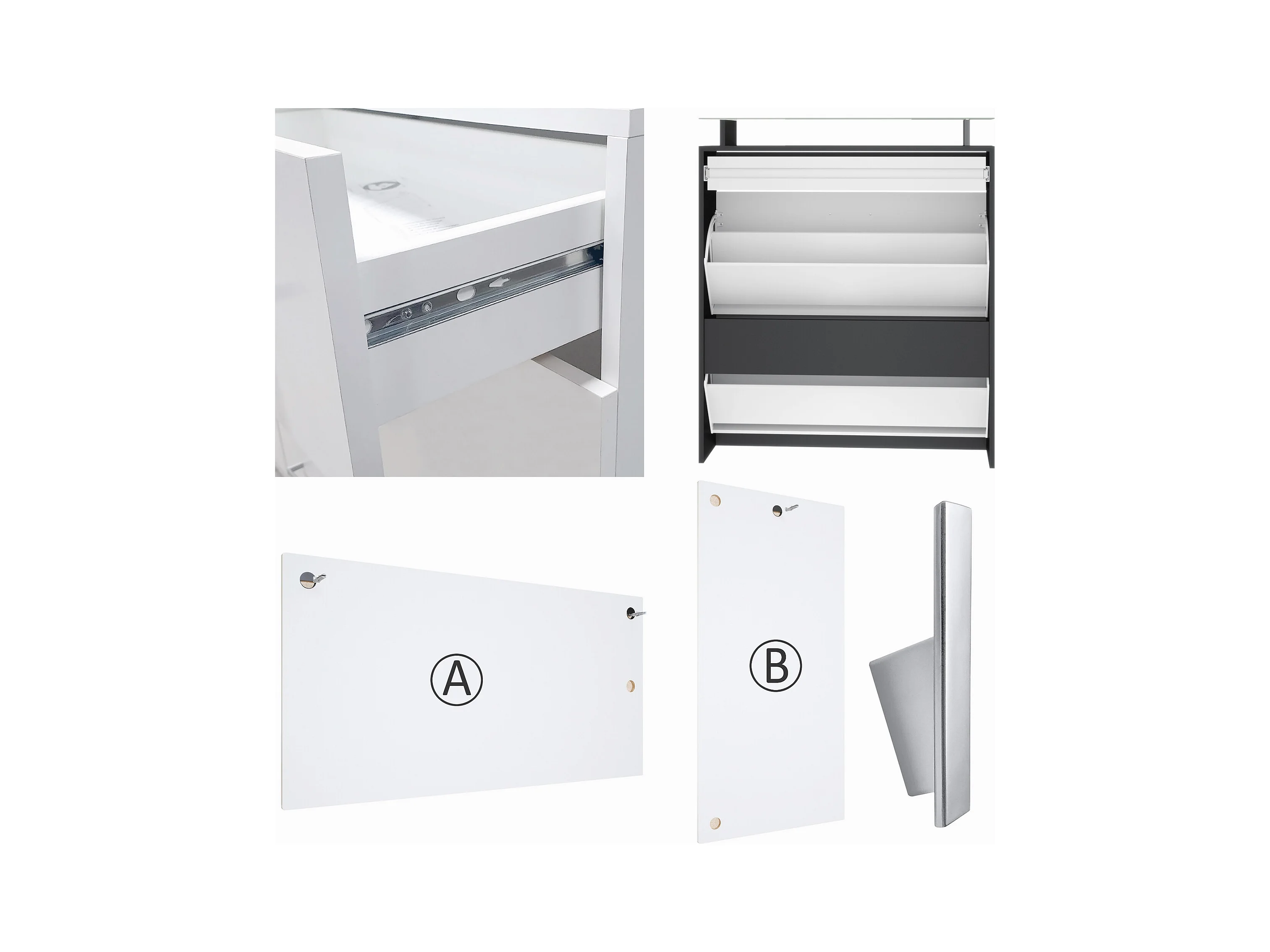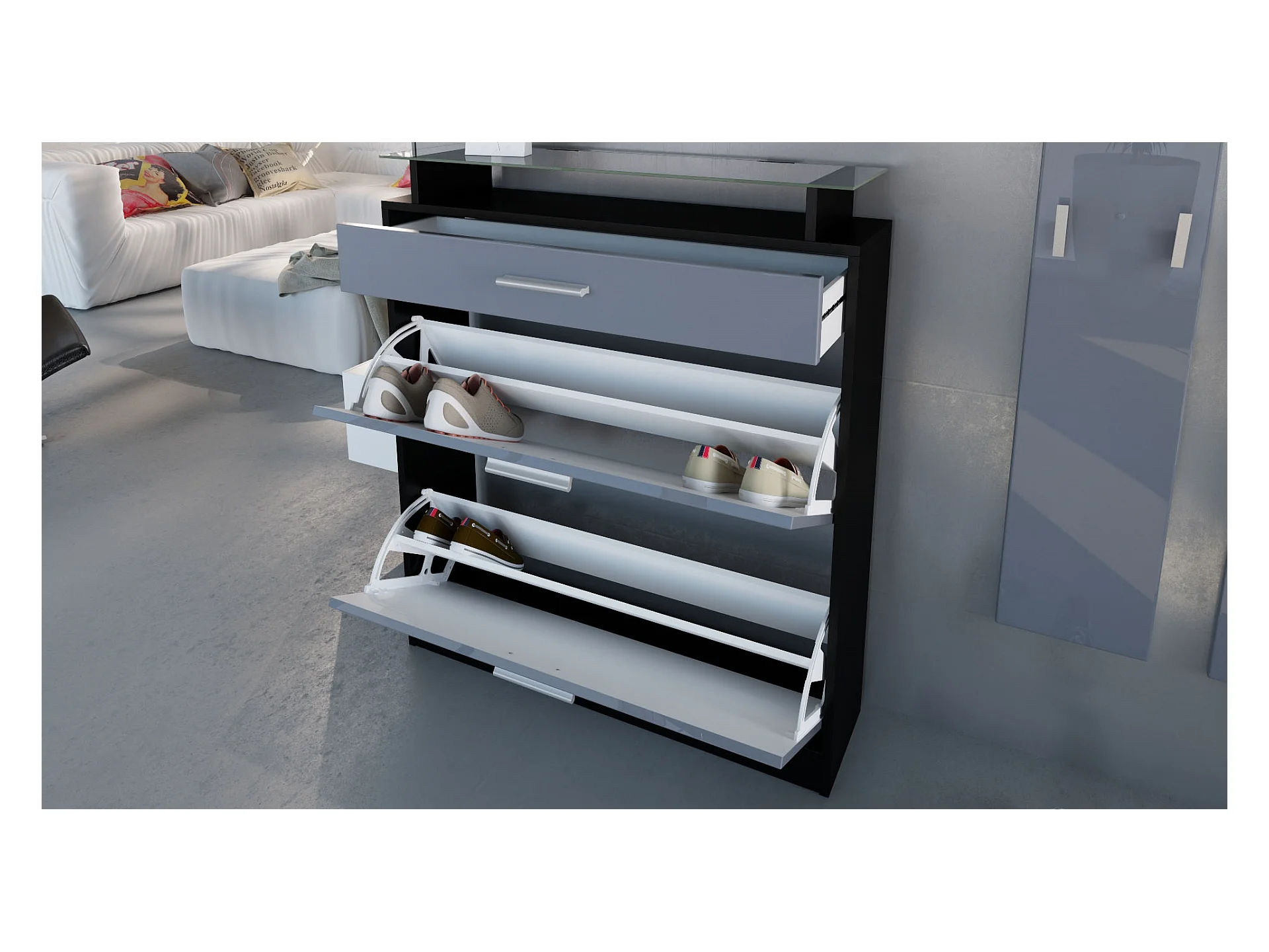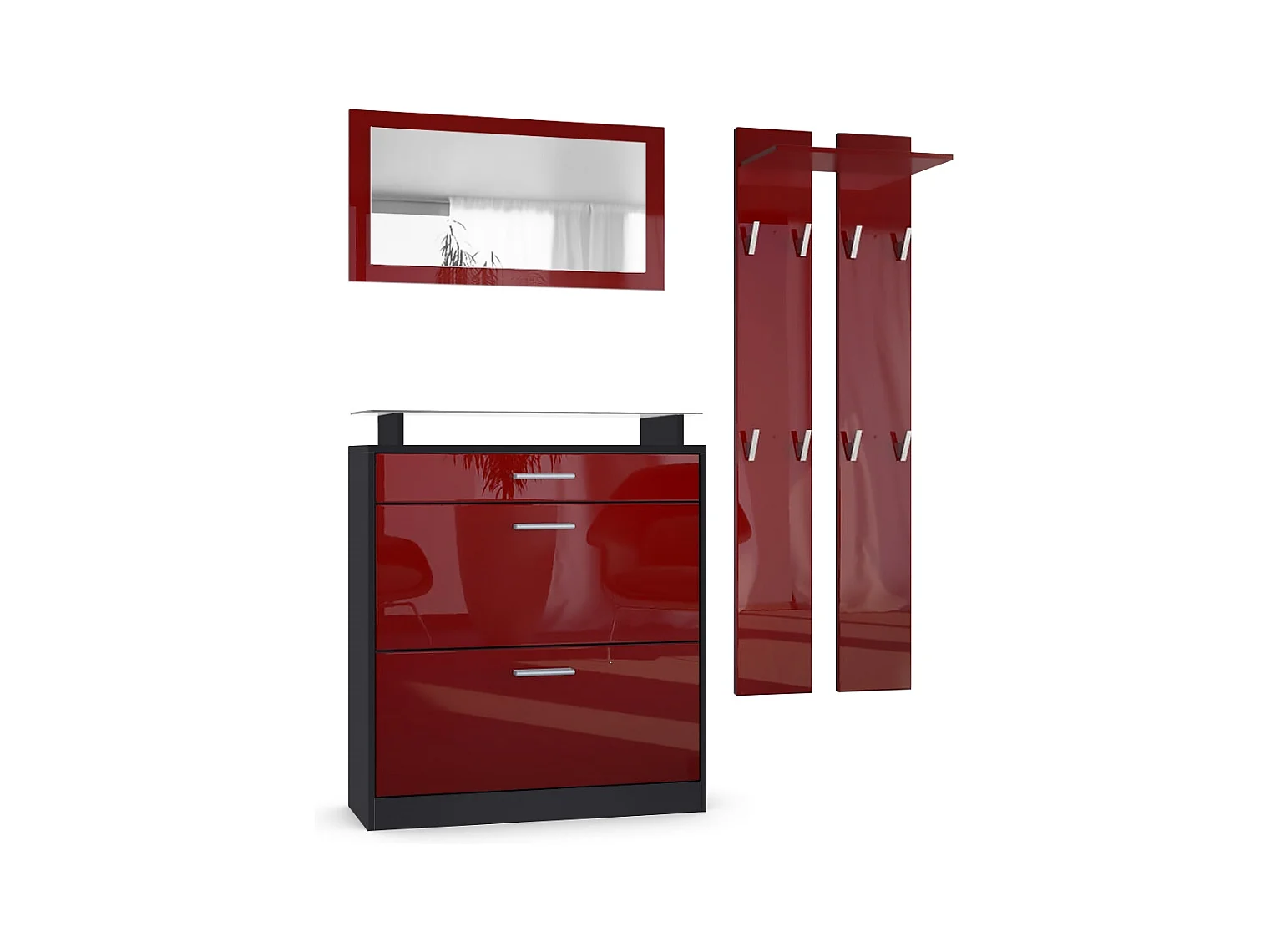 Penderie Loret Mini, Meuble d’entrée comprenant 1 commode à chaussures, 1 miroir mural et 2 panneaux porte-manteaux, Noir mat/Bordeaux haute brillance