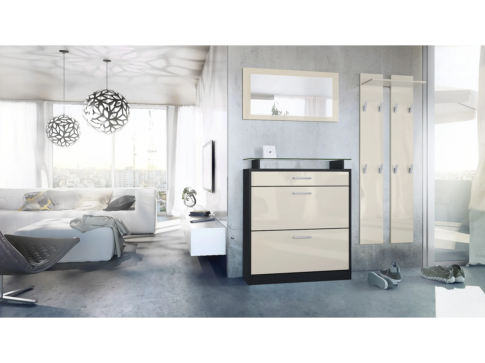 Penderie Loret Mini, Meuble d’entrée comprenant 1 commode à chaussures, 1 miroir mural et 2 panneaux porte-manteaux, Noir mat/Crème haute brillance