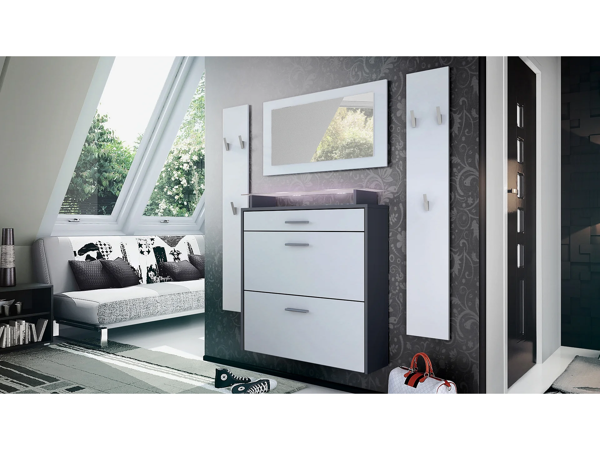 Penderie Malea, Meuble d’entrée comprenant 1 commode à chaussures murale, 1 miroir et 2 panneaux porte-manteaux, Anthracite mat/Blanc mat, LED blanc inclus