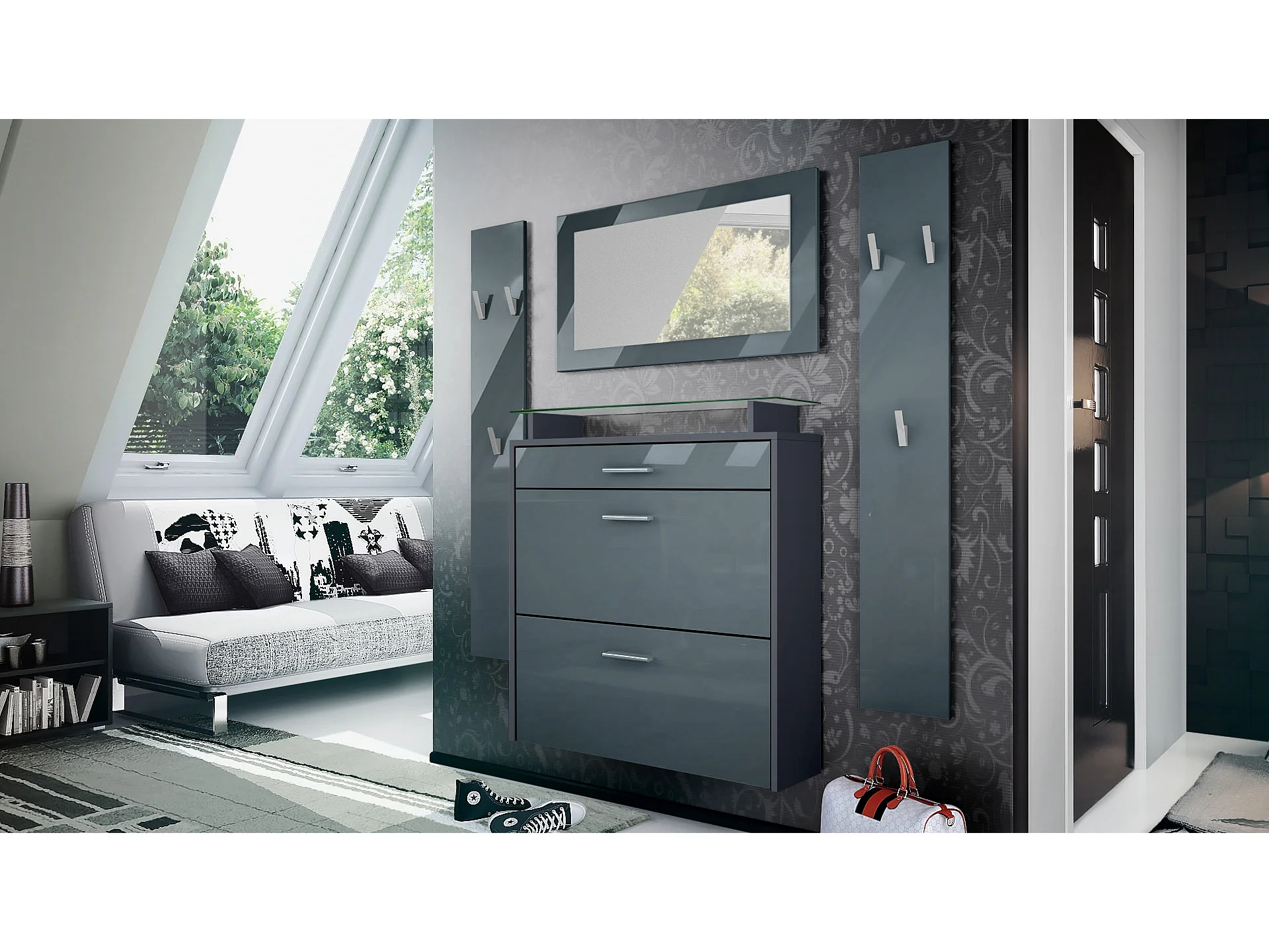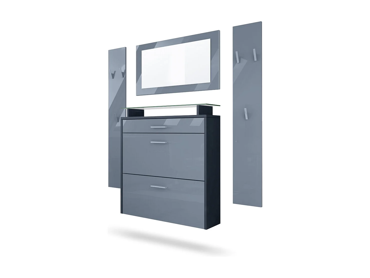 Penderie Malea, Meuble d’entrée comprenant 1 commode à chaussures murale, 1 miroir mural et 2 panneaux porte-manteaux, Anthracite mat/Gris haute brillance