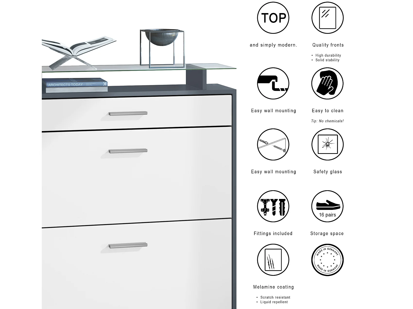 Penderie Malea, Meuble d’entrée comprenant 1 commode à chaussures murale, 1 miroir mural et 2 panneaux porte-manteaux, Anthracite mat/Noir mat